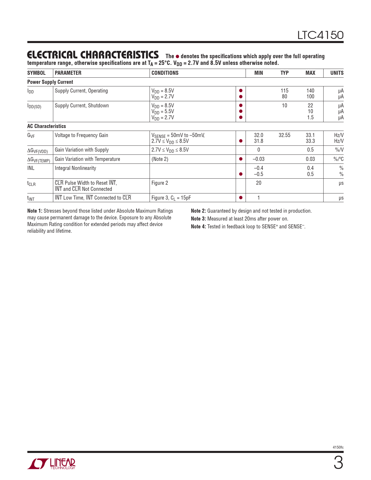 LTC4150 ELECTRICAL CHARACTERISTICSThe l denotes the specifi cations which apply over the full operatingtemperature range, otherwise specifi cations are at TA = 25°C. VDD = 2.7V and 8.5V unless otherwise noted.SYMBOLPARAMETERCONDITIONSMINTYPMAXUNITSPower Supply Current IDD Supply Current, Operating VDD = 8.5V l 115 140 μA VDD = 2.7V l 80 100 μA IDD(SD) Supply Current, Shutdown VDD = 8.5V l 10 22 μA VDD = 5.5V l 10 μA VDD = 2.7V l 1.5 μA AC Characteristics GVF Voltage to Frequency Gain VSENSE = 50mV to –50mV, 32.0 32.55 33.1 Hz/V 2.7V ≤ VDD ≤ 8.5V l 31.8 33.3 Hz/V ΔGVF(VDD) Gain Variation with Supply 2.7V ≤ VDD ≤ 8.5V 0 0.5 %/V ΔGVF(TEMP) Gain Variation with Temperature (Note 2) l –0.03 0.03 %/ºC INL Integral Nonlinearity –0.4 0.4 % l –0.5 0.5 % tCLR CLR Pulse Width to Reset INT, Figure 2 20 μs INT and CLR Not Connected tINT INT Low Time, INT Connected to CLR Figure 3, CL = 15pF l 1 μs Note 1: Stresses beyond those listed under Absolute Maximum Ratings Note 2: Guaranteed by design and not tested in production. may cause permanent damage to the device. Exposure to any Absolute Note 3: Measured at least 20ms after power on. Maximum Rating condition for extended periods may affect device Note 4: Tested in feedback loop to SENSE+ and SENSE–. reliability and lifetime. 4150fc 3 Document Outline FEATURES DESCRIPTION APPLICATIONS TYPICAL APPLICATION ABSOLUTE MAXIMUM RATINGS PIN CONFIGURATION ORDER INFORMATION ELECTRICAL CHARACTERISTICS TYPICAL PERFORMANCE CHARACTERISTICS PIN FUNCTIONS BLOCK DIAGRAM TIMING DIAGRAMS OPERATION APPLICATIONS INFORMATION TYPICAL APPLICATIONS PACKAGE DESCRIPTION REVISION HISTORY TYPICAL APPLICATION RELATED PARTS