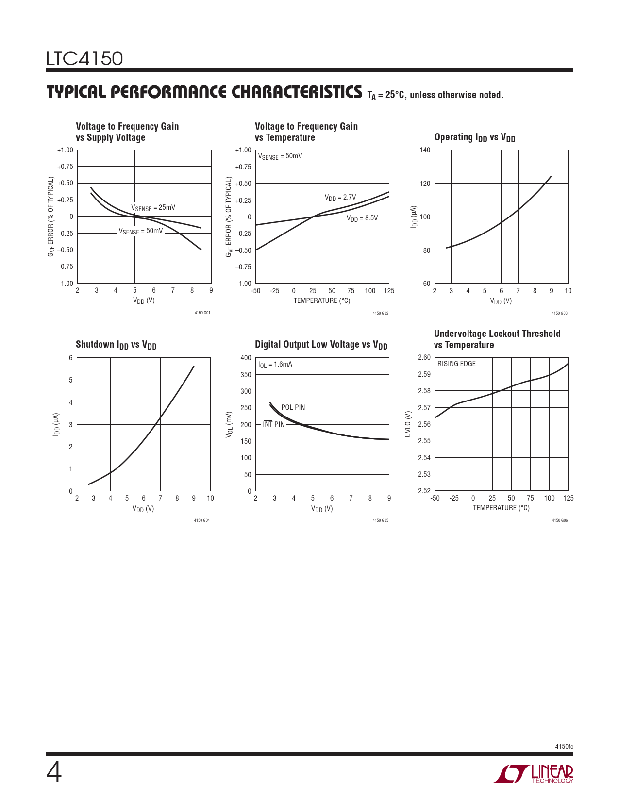 +1.00 +1.00 140 VSENSE = 50mV +0.75 +0.75 +0.50 +0.50 120 YPICAL) +0.25 YPICAL) +0.25 VDD = 2.7V VSENSE = 25mV 0 0 VDD = 8.5V (μA) 100 I DD –0.25 VSENSE = 50mV –0.25 ERROR (% OF T ERROR (% OF T VF –0.50 VF –0.50 80 G G –0.75 –0.75 –1.00 –1.00 60 2 3 4 5 6 7 8 9 -50 -25 0 25 50 75 100 125 2 3 4 5 6 7 8 9 10 VDD (V) TEMPERATURE (°C) VDD (V) 4150 G01 4150 G02 4150 G03