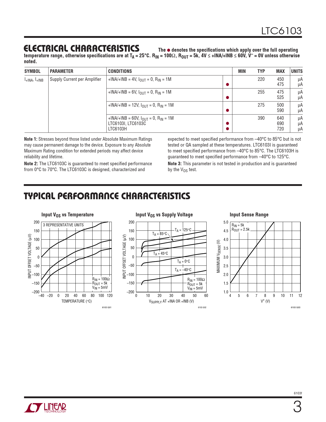 LTC6103 ELECTRICAL CHARACTERISTICSThe ● denotes the specifi cations which apply over the full operatingtemperature range, otherwise specifi cations are at TA = 25°C. RIN = 100 Ω , ROUT = 5k, 4V ≤ +INA/+INB ≤ 60V, V– = 0V unless otherwise noted.SYMBOLPARAMETERCONDITIONSMINTYPMAXUNITS I+INA, I+INB Supply Current per Amplifi er +INA/+INB = 4V, IOUT = 0, RIN = 1M 220 450 µA ● 475 µA +INA/+INB = 6V, IOUT = 0, RIN = 1M 255 475 µA ● 525 µA +INA/+INB = 12V, IOUT = 0, RIN = 1M 275 500 µA ● 590 µA +INA/+INB = 60V, IOUT = 0, RIN = 1M 390 640 µA LTC6103I, LTC6103C ● 690 µA LTC6103H ● 720 µA Note 1: Stresses beyond those listed under Absolute Maximum Ratings expected to meet specifi ed performance from –40°C to 85°C but is not may cause permanent damage to the device. Exposure to any Absolute tested or QA sampled at these temperatures. LTC6103I is guaranteed Maximum Rating condition for extended periods may affect device to meet specifi ed performance from –40°C to 85°C. The LTC6103H is reliability and lifetime. guaranteed to meet specifi ed performance from –40°C to 125°C. Note 2: The LTC6103C is guaranteed to meet specifi ed performance Note 3: This parameter is not tested in production and is guaranteed from 0°C to 70°C. The LTC6103C is designed, characterized and by the VOS test. TYPICAL PERFORMANCE CHARACTERISTICSInput VOS vs TemperatureInput VOS vs Supply VoltageInput Sense Range 200 200 5.0 3 REPRESENTATIVE UNITS RIN = 5k 150 150 TA = 125°C 4.5 ROUT = 2.5k TA = 85°C µV) 100 µV) 100 4.0 (V) 50 50 3.5 T SENSE A = 45°C 0 0 3.0 TA = 0°C –50 –50 2.5 TA = –40°C MAXIMUM V –100 –100 2.0 INPUT OFFSET VOLTAGE ( R INPUT OFFSET VOLTAGE ( IN = 100Ω RIN = 100Ω –150 ROUT = 5k –150 ROUT = 5k 1.5 VIN = 5mV VIN = 5mV –200 –200 1.0 –40 –20 0 20 40 60 80 100 120 0 10 20 30 40 50 60 4 5 6 7 8 9 10 11 12 TEMPERATURE (°C) VSUPPLY AT +INA OR +INB (V) V+ (V) 6103 G01 6103 G02 6103 G03 6103f 3