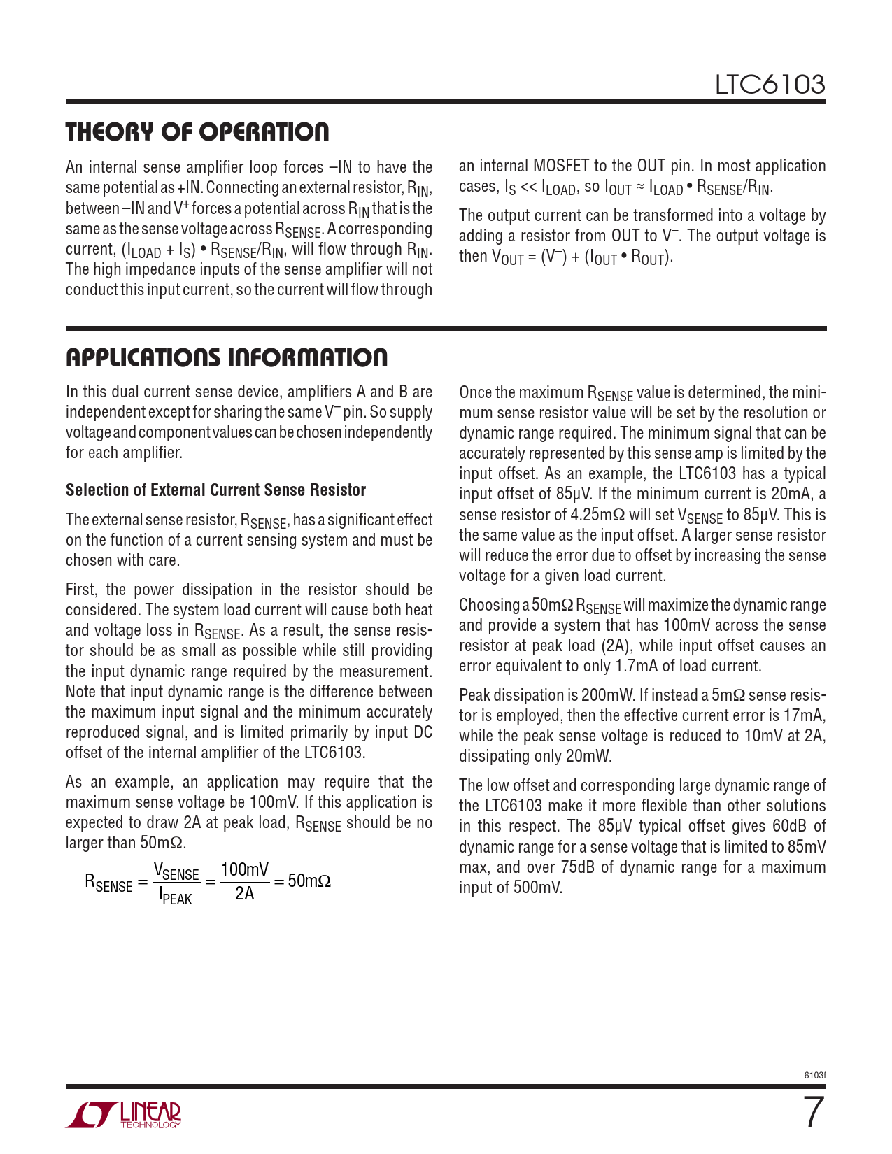 LTC6103 THEORY OF OPERATION An internal sense amplifi er loop forces –IN to have the an internal MOSFET to the OUT pin. In most application same potential as +IN. Connecting an external resistor, RIN, cases, IS << ILOAD, so IOUT ≈ ILOAD • RSENSE/RIN. between –IN and V+ forces a potential across RIN that is the The output current can be transformed into a voltage by same as the sense voltage across RSENSE. A corresponding adding a resistor from OUT to V–. The output voltage is current, (ILOAD + IS) • RSENSE/RIN, will fl ow through RIN. then VOUT = (V–) + (IOUT • ROUT). The high impedance inputs of the sense amplifi er will not conduct this input current, so the current will fl ow through APPLICATIONS INFORMATION In this dual current sense device, amplifi ers A and B are Once the maximum RSENSE value is determined, the mini- independent except for sharing the same V– pin. So supply mum sense resistor value will be set by the resolution or voltage and component values can be chosen independently dynamic range required. The minimum signal that can be for each amplifi er. accurately represented by this sense amp is limited by the input offset. As an example, the LTC6103 has a typical Selection of External Current Sense Resistor input offset of 85µV. If the minimum current is 20mA, a The external sense resistor, R sense resistor of 4.25mΩ will set V SENSE, has a signifi cant effect SENSE to 85µV. This is on the function of a current sensing system and must be the same value as the input offset. A larger sense resistor chosen with care. will reduce the error due to offset by increasing the sense voltage for a given load current. First, the power dissipation in the resistor should be considered. The system load current will cause both heat Choosing a 50mΩ RSENSE will maximize the dynamic range and voltage loss in R and provide a system that has 100mV across the sense SENSE. As a result, the sense resis- tor should be as small as possible while still providing resistor at peak load (2A), while input offset causes an the input dynamic range required by the measurement. error equivalent to only 1.7mA of load current. Note that input dynamic range is the difference between Peak dissipation is 200mW. If instead a 5mΩ sense resis- the maximum input signal and the minimum accurately tor is employed, then the effective current error is 17mA, reproduced signal, and is limited primarily by input DC while the peak sense voltage is reduced to 10mV at 2A, offset of the internal amplifi er of the LTC6103. dissipating only 20mW. As an example, an application may require that the The low offset and corresponding large dynamic range of maximum sense voltage be 100mV. If this application is the LTC6103 make it more fl exible than other solutions expected to draw 2A at peak load, RSENSE should be no in this respect. The 85µV typical offset gives 60dB of larger than 50mΩ. dynamic range for a sense voltage that is limited to 85mV V mV 100 max, and over 75dB of dynamic range for a maximum R SENSE = = = m SENSE 50 Ω I 2A input of 500mV. PEAK 6103f 7