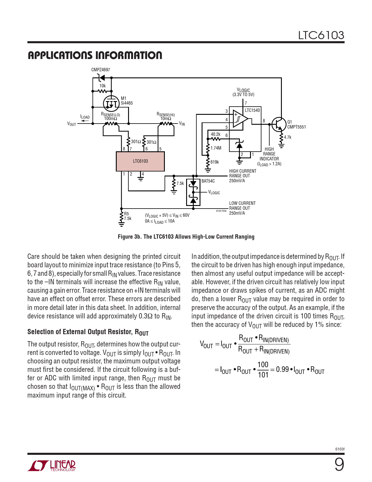 LTC6103 APPLICATIONS INFORMATION CMPZ4697 10k VLOGIC (3.3V TO 5V) M1 Si4465 7 3 LTC1540 RSENSE(LO) R + I SENSE(HI) LOAD 100mΩ 10mΩ 4 8 V Q1 – OUT VIN 5 CMPT5551 40.2k 6 4.7k 301Ω 301Ω 8 7 6 5 1.74M HIGH 2 1 RANGE INDICATOR LTC6103 619k (ILOAD > 1.2A) HIGH CURRENT 1 2 4 RANGE OUT BAT54C 250mV/A 7.5k VLOGIC LOW CURRENT RANGE OUT 6103 F03b R5 250mV/A (VLOGIC + 5V) ≤ VIN ≤ 60V 7.5k 0A ≤ ILOAD ≤ 10A Figure 3b. The LTC6103 Allows High-Low Current Ranging Care should be taken when designing the printed circuit In addition, the output impedance is determined by ROUT. If board layout to minimize input trace resistance (to Pins 5, the circuit to be driven has high enough input impedance, 6, 7 and 8), especially for small RIN values. Trace resistance then almost any useful output impedance will be accept- to the –IN terminals will increase the effective RIN value, able. However, if the driven circuit has relatively low input causing a gain error. Trace resistance on +IN terminals will impedance or draws spikes of current, as an ADC might have an effect on offset error. These errors are described do, then a lower ROUT value may be required in order to in more detail later in this data sheet. In addition, internal preserve the accuracy of the output. As an example, if the device resistance will add approximately 0.3Ω to RIN. input impedance of the driven circuit is 100 times ROUT, then the accuracy of VOUT will be reduced by 1% since: Selection of External Output Resistor, ROUT R • R OUT IN DRIV ( EN) The output resistor, ROUT, determines how the output cur- V = I OUT OUT • R + R rent is converted to voltage. V OUT IN DRIV ( EN) OUT is simply IOUT • ROUT. In choosing an output resistor, the maximum output voltage 100 must fi rst be considered. If the circuit following is a buf- = I • R • = . 0 99 • I • R OUT OUT OUT OUT fer or ADC with limited input range, then R 101 OUT must be chosen so that IOUT(MAX) • ROUT is less than the allowed maximum input range of this circuit. 6103f 9