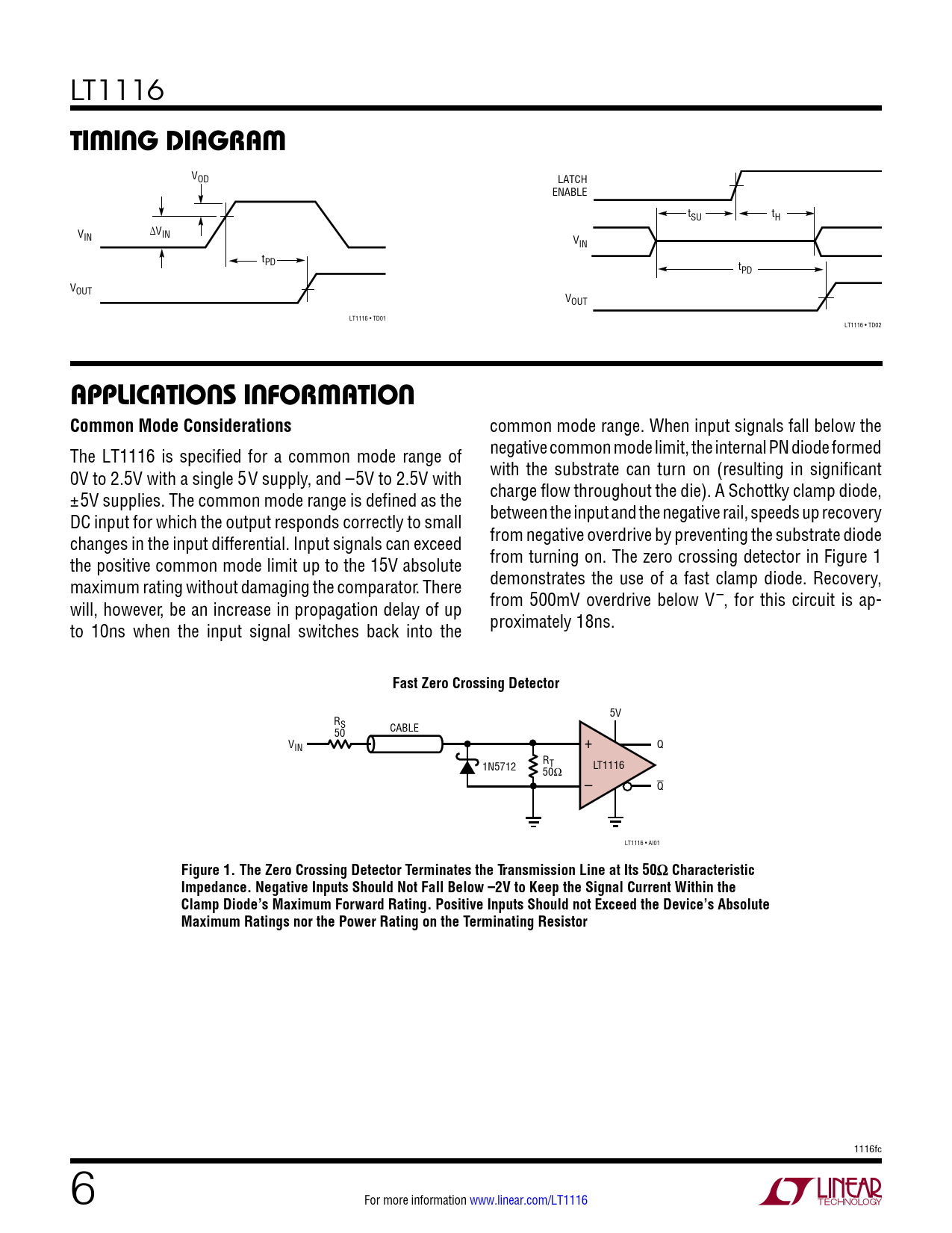LT1116 TiMing DiagraM VOD LATCH ENABLE tSU tH ∆V V IN IN VIN tPD tPD VOUT VOUT LT1116 • TD01 LT1116 • TD02 applicaTions inForMaTion Common Mode Considerations com mon mode range. When input signals fall below the The LT1116 is specified for a common mode range of negative common mode limit, the internal PN diode formed 0V to 2.5V with a single 5V supply, and –5V to 2.5V with with the substrate can turn on (resulting in significant ±5V supplies. The common mode range is defined as the charge flow throughout the die). A Schottky clamp diode, DC input for which the output responds correctly to small between the input and the negative rail, speeds up recovery changes in the input differential. Input signals can exceed from negative overdrive by preventing the substrate diode the positive common mode limit up to the 15V absolute from turning on. The zero crossing detector in Figure 1 maximum rating without damaging the comparator. There demonstrates the use of a fast clamp diode. Recovery, will, however, be an increase in propagation delay of up from 500mV overdrive below V–, for this circuit is ap- to 10ns when the input signal switches back into the proximately 18ns. Fast Zero Crossing Detector 5V RS CABLE 50 V + Q IN R 1N5712 T LT1116 50Ω – Q LT1116 • AI01 Figure 1. The Zero Crossing Detector Terminates the Transmission Line at Its 50Ω CharacteristicImpedance. Negative Inputs Should Not Fall Below –2V to Keep the Signal Current Within theClamp Diode’s Maximum Forward Rating. Positive Inputs Should not Exceed the Device’s AbsoluteMaximum Ratings nor the Power Rating on the Terminating Resistor 1116fc 6 For more information www.linear.com/LT1116