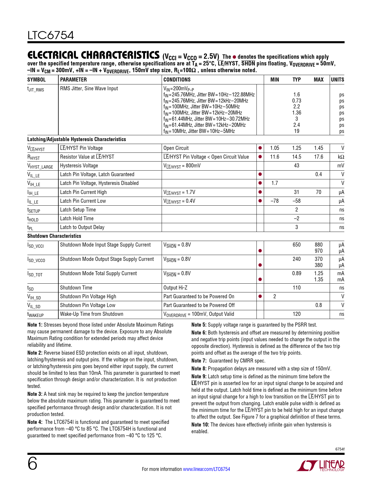 LTC6754 elecTrical characTerisTics (VCCI = VCCO = 2.5V) The l denotes the specifications which applyover the specified temperature range, otherwise specifications are at TA = 25°C, LE/HYST, SHDN pins floating, VOVERDRIVE = 50mV,–IN = VCM = 300mV, +IN = –IN + VOVERDRIVE, 150mV step size, RL=100Ω , unless otherwise noted. SYMBOLPARAMETERCONDITIONSMINTYPMAXUNITS tJIT_RMS RMS Jitter, Sine Wave Input VIN = 200mVP–P fIN = 245.76MHz, Jitter BW = 10Hz – 122.88MHz 1.6 ps fIN = 245.76MHz, Jitter BW = 12kHz – 20MHz 0.73 ps fIN = 100MHz, Jitter BW = 10Hz – 50MHz 2.2 ps fIN = 100MHz, Jitter BW = 12kHz – 20MHz 1.36 ps fIN = 61.44MHz, Jitter BW = 10Hz – 30.72MHz 3 ps fIN = 61.44MHz, Jitter BW = 12kHz – 20MHz 2.4 ps fIN = 10MHz, Jitter BW = 10Hz – 5MHz 19 ps Latching/Adjustable Hysteresis Characteristics VLE/HYST LE/HYST Pin Voltage Open Circuit l 1.05 1.25 1.45 V RHYST Resistor Value at LE/HYST LE/HYST Pin Voltage < Open Circuit Value l 11.6 14.5 17.6 kΩ VHYST_LARGE Hysteresis Voltage VLE/HYST = 800mV 43 mV VIL_LE Latch Pin Voltage, Latch Guaranteed l 0.4 V VIH_LE Latch Pin Voltage, Hysteresis Disabled l 1.7 V IIH_LE Latch Pin Current High VLE/HYST = 1.7V l 31 70 µA IIL_LE Latch Pin Current Low VLE/HYST = 0.4V l –78 –58 µA tSETUP Latch Setup Time 2 ns tHOLD Latch Hold Time –2 ns tPL Latch to Output Delay 3 ns Shutdown Characteristics ISD_VCCI Shutdown Mode Input Stage Supply Current VSHDN = 0.8V 650 880 μA l 970 µA ISD_VCCO Shutdown Mode Output Stage Supply Current VSHDN = 0.8V 240 370 μA l 380 µA ISD_TOT Shutdown Mode Total Supply Current VSHDN = 0.8V 0.89 1.25 mA l 1.35 mA tSD Shutdown Time Output Hi-Z 110 ns VIH_SD Shutdown Pin Voltage High Part Guaranteed to be Powered On l 2 V VIL_SD Shutdown Pin Voltage Low Part Guaranteed to be Powered Off 0.8 V tWAKEUP Wake-Up Time from Shutdown VOVERDRIVE = 100mV, Output Valid 120 ns Note 1: Stresses beyond those listed under Absolute Maximum Ratings Note 5: Supply voltage range is guaranteed by the PSRR test. may cause permanent damage to the device. Exposure to any Absolute Note 6: Both hysteresis and offset are measured by determining positive Maximum Rating condition for extended periods may affect device and negative trip points (input values needed to change the output in the reliability and lifetime. opposite direction). Hysteresis is defined as the difference of the two trip Note 2: Reverse biased ESD protection exists on all input, shutdown, points and offset as the average of the two trip points. latching/hysteresis and output pins. If the voltage on the input, shutdown, Note 7: Guaranteed by CMRR spec. or latching/hysteresis pins goes beyond either input supply, the current Note 8: Propagation delays are measured with a step size of 150mV. should be limited to less than 10mA. This parameter is guaranteed to meet specification through design and/or characterization. It is not production Note 9: Latch setup time is defined as the minimum time before the tested. LE /HYST pin is asserted low for an input signal change to be acquired and held at the output. Latch hold time is defined as the minimum time before Note 3: A heat sink may be required to keep the junction temperature an input signal change for a high to low transition on the LE/HYST pin to below the absolute maximum rating. This parameter is guaranteed to meet prevent the output from changing. Latch enable pulse width is defined as specified performance through design and/or characterization. It is not the minimum time for the LE/HYST pin to be held high for an input change production tested. to affect the output. See Figure 7 for a graphical definition of these terms. Note 4: The LTC6754I is functional and guaranteed to meet specified Note 10: The devices have effectively infinite gain when hysteresis is performance from –40 °C to 85 °C. The LTC6754H is functional and enabled. guaranteed to meet specified performance from –40 °C to 125 °C. 6754f 6 For more information www.linear.com/LTC6754 Document Outline Features Applications Typical Application Description Absolute Maximum Ratings Order Information Pin Configuration Electrical Characteristics Typical Performance Characteristics Pin Functions Applications Information Package Description Revision History Typical Application Related Parts