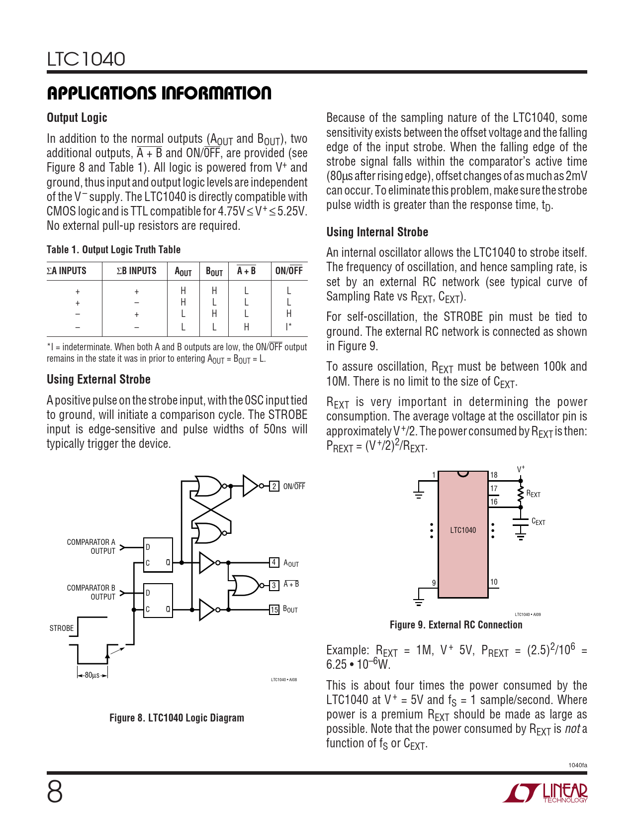 LTC1040 UUWUAPPLICATIO S I FOR ATIOOutput Logic Because of the sampling nature of the LTC1040, some sensitivity exists between the offset voltage and the falling In addition to the normal outputs (AOUT and BOUT), two edge of the input strobe. When the falling edge of the additional outputs, A + B and ON/0FF, are provided (see strobe signal falls within the comparator’s active time Figure 8 and Table 1). All logic is powered from V+ and (80µs after rising edge), offset changes of as much as 2mV ground, thus input and output logic levels are independent can occur. To eliminate this problem, make sure the strobe of the V – supply. The LTC1040 is directly compatible with pulse width is greater than the response time, t CMOS logic and is TTL compatible for 4.75V ≤ V+ ≤ 5.25V. D. No external pull-up resistors are required. Using Internal StrobeTable 1. Output Logic Truth Table An internal oscillator allows the LTC1040 to strobe itself. Σ A INPUTS Σ B INPUTSA The frequency of oscillation, and hence sampling rate, is OUTBOUTA + BON/OFF set by an external RC network (see typical curve of + + H H L L Sampling Rate vs R + – H L L L EXT, CEXT). – + L H L H For self-oscillation, the STROBE pin must be tied to – – L L H I* ground. The external RC network is connected as shown *I = indeterminate. When both A and B outputs are low, the ON/OFF output in Figure 9. remains in the state it was in prior to entering AOUT = BOUT = L. To assure oscillation, REXT must be between 100k and Using External Strobe 10M. There is no limit to the size of CEXT. A positive pulse on the strobe input, with the 0SC input tied REXT is very important in determining the power to ground, will initiate a comparison cycle. The STROBE consumption. The average voltage at the oscillator pin is input is edge-sensitive and pulse widths of 50ns will approximately V+/2. The power consumed by REXT is then: typically trigger the device. PREXT = (V +/2)2/REXT. V+ 1 18 2 ON/OFF 17 REXT 16 CEXT LTC1040 COMPARATOR A D OUTPUT C Q 4 AOUT A + B 9 10 COMPARATOR B 3 D OUTPUT C Q 15 BOUT LTC1040 • AI09 STROBE Figure 9. External RC Connection Example: REXT = 1M, V + 5V, PREXT = (2.5)2/106 = 6.25 • 10–6W. 80µs LTC1040 • AI08 This is about four times the power consumed by the LTC1040 at V + = 5V and fS = 1 sample/second. Where Figure 8. LTC1040 Logic Diagram power is a premium REXT should be made as large as possible. Note that the power consumed by REXT is not a function of fS or CEXT. 1040fa 8