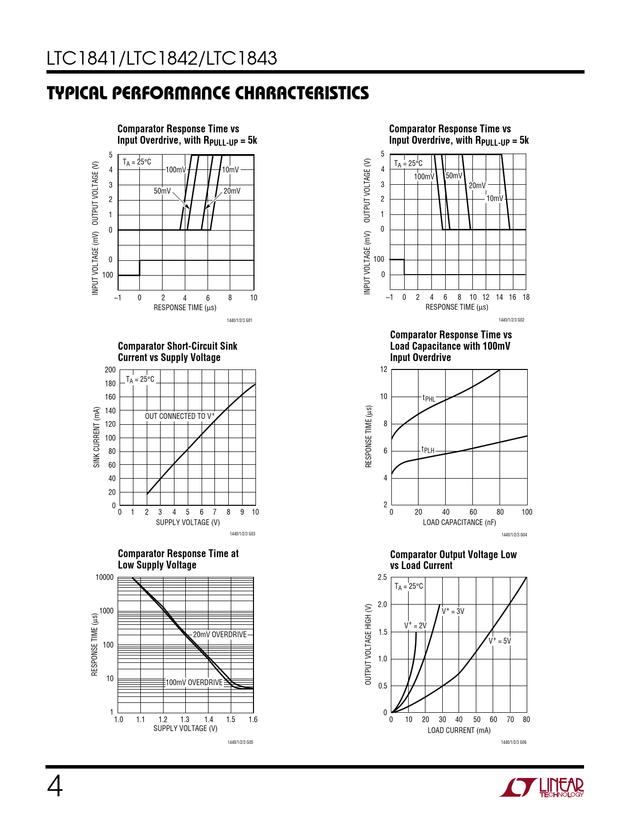 5 5 TA = 25°C TA = 25°C 4 100mV 10mV 4 100mV 50mV 3 3 20mV 50mV 20mV 2 2 10mV 1 1 OUTPUT VOLTAGE (V) OUTPUT VOLTAGE (V) 0 0 0 100 100 0 INPUT VOLTAGE (mV) INPUT VOLTAGE (mV) –1 0 2 4 6 8 10 –1 0 2 4 6 8 10 12 14 16 18 RESPONSE TIME (µs) RESPONSE TIME (µs) 1440/1/2/3 G01 1440/1/2/3 G02