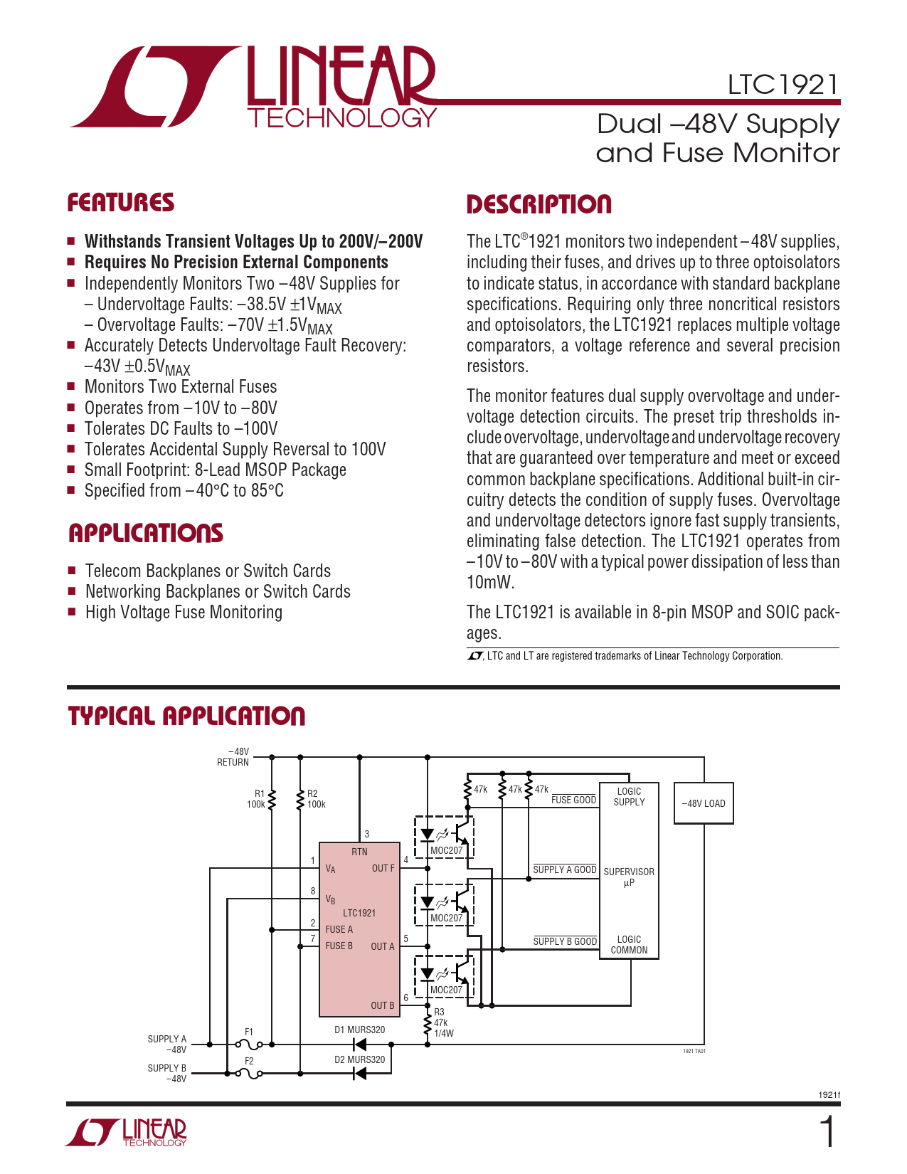 eliminating false detection. The LTC1921 operates from –10V to –80V with a typical power dissipation of less than ■ Telecom Backplanes or Switch Cards 10mW. ■ Networking Backplanes or Switch Cards ■ High Voltage Fuse Monitoring The LTC1921 is available in 8-pin MSOP and SOIC pack- ages. , LTC and LT are registered trademarks of Linear Technology Corporation.