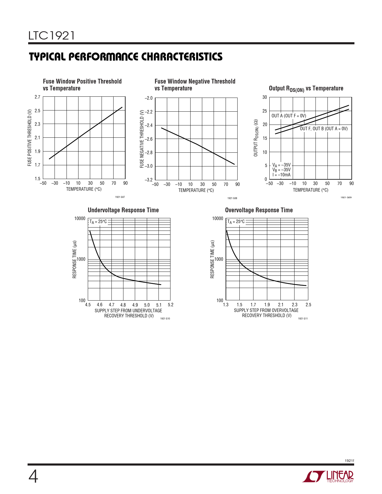 2.7 –2.0 30 2.5 –2.2 25 OUT A (OUT F = 0V) 2.3 Ω –2.4 ( 20 OUT F, OUT B (OUT A = 0V) 2.1 DS(ON) –2.6 15 1.9 –2.8 10 OUTPUT R FUSE POSITIVE THRESHOLD (V) 1.7 FUSE NEGATIVE THRESHOLD (V) –3.0 5 VA = –35V VB = –35V I = –10mA 1.5 –3.2 0 –50 –30 –10 10 30 50 70 90 –50 –30 –10 10 30 50 70 90 –50 –30 –10 10 30 50 70 90 TEMPERATURE (°C) TEMPERATURE (°C) TEMPERATURE (°C) 1921 G07 1921 G08 1921 G09