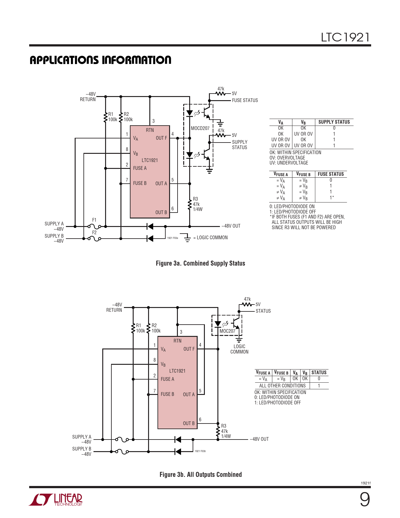 MOCD207 OK OK 0 RTN 47k 1 4 5V OK UV OR OV 1 V OUT F A UV OR OV OK 1 SUPPLY STATUS UV OR OV UV OR OV 1 8 VB OK: WITHIN SPECIFICATION OV: OVERVOLTAGE LTC1921 2 UV: UNDERVOLTAGE FUSE A