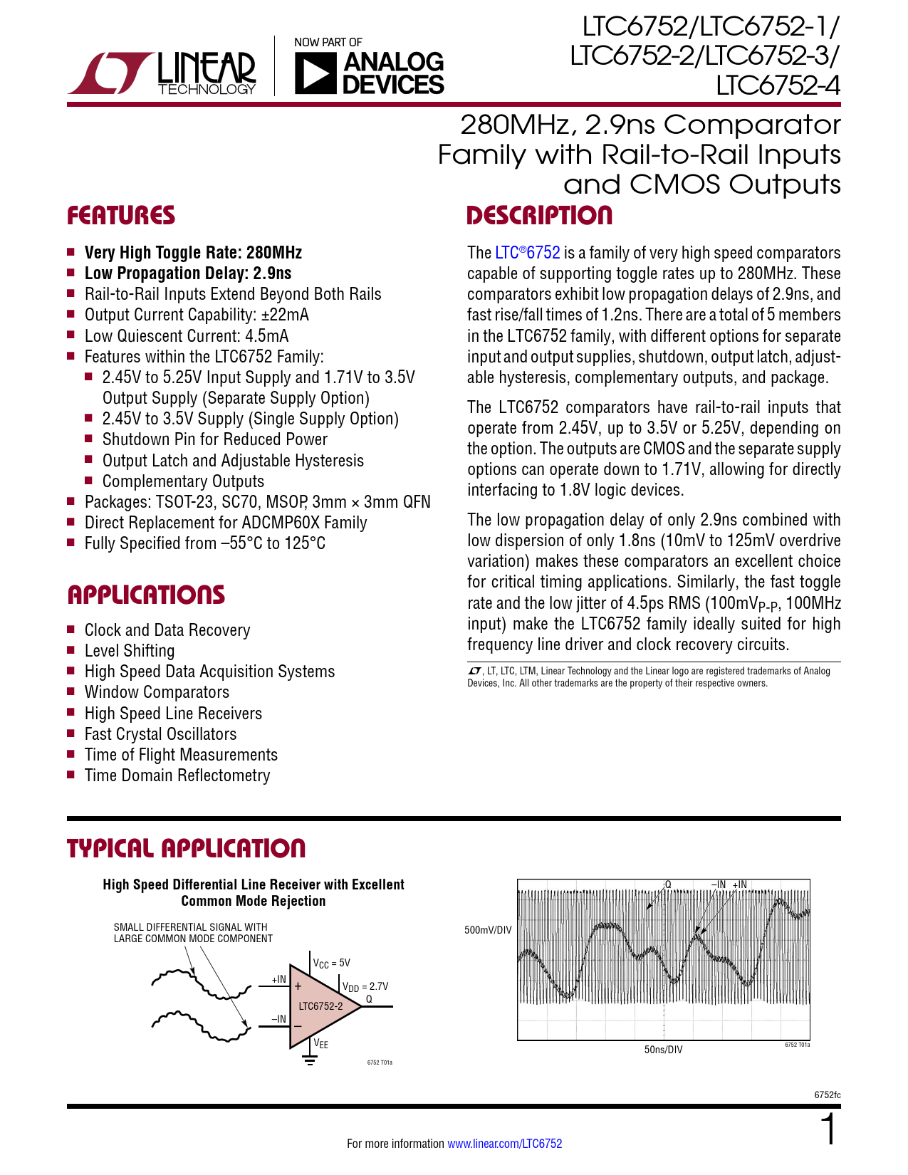 LTC6752/LTC6752-1/ LTC6752-2/LTC6752-3/ LTC6752-4 280MHz, 2.9ns Comparator Family with Rail-to-Rail Inputs and CMOS Outputs FeaTuresDescripTion n Very High Toggle Rate: 280MHz The LTC®6752 is a family of very high speed comparators n Low Propagation Delay: 2.9ns capable of supporting toggle rates up to 280MHz. These n Rail-to-Rail Inputs Extend Beyond Both Rails comparators exhibit low propagation delays of 2.9ns, and n Output Current Capability: ±22mA fast rise/fall times of 1.2ns. There are a total of 5 members n Low Quiescent Current: 4.5mA in the LTC6752 family, with different options for separate n Features within the LTC6752 Family: input and output supplies, shutdown, output latch, adjust- n 2.45V to 5.25V Input Supply and 1.71V to 3.5V able hysteresis, complementary outputs, and package. Output Supply (Separate Supply Option) The LTC6752 comparators have rail-to-rail inputs that n 2.45V to 3.5V Supply (Single Supply Option) operate from 2.45V, up to 3.5V or 5.25V, depending on n Shutdown Pin for Reduced Power the option. The outputs are CMOS and the separate supply n Output Latch and Adjustable Hysteresis options can operate down to 1.71V, allowing for directly n Complementary Outputs interfacing to 1.8V logic devices. n Packages: TSOT-23, SC70, MSOP, 3mm × 3mm QFN n Direct Replacement for ADCMP60X Family The low propagation delay of only 2.9ns combined with n Fully Specified from –55°C to 125°C low dispersion of only 1.8ns (10mV to 125mV overdrive variation) makes these comparators an excellent choice for critical timing applications. Similarly, the fast toggle applicaTions rate and the low jitter of 4.5ps RMS (100mVP-P, 100MHz n input) make the LTC6752 family ideally suited for high Clock and Data Recovery n frequency line driver and clock recovery circuits. Level Shifting n High Speed Data Acquisition Systems L, LT, LTC, LTM, Linear Technology and the Linear logo are registered trademarks of Analog Devices, Inc. All other trademarks are the property of their respective owners. n Window Comparators n High Speed Line Receivers n Fast Crystal Oscillators n Time of Flight Measurements n Time Domain Reflectometry Typical applicaTionHigh Speed Differential Line Receiver with Excellent Q –IN +IN Common Mode Rejection SMALL DIFFERENTIAL SIGNAL WITH 500mV/DIV LARGE COMMON MODE COMPONENT VCC = 5V +IN + VDD = 2.7V Q LTC6752-2 –IN – VEE 50ns/DIV 6752 T01a 6752 T01a 6752fc For more information www.linear.com/LTC6752 1 Document Outline Features Applications Typical Application Description Absolute Maximum Ratings Pin Configuration Order Information Electrical Characteristics Typical Performance Characteristics DC Typical Performance Characteristics AC Pin Functions Block Diagram Applications Information Typical Applications Package Description Revision History Typical Application Related Parts