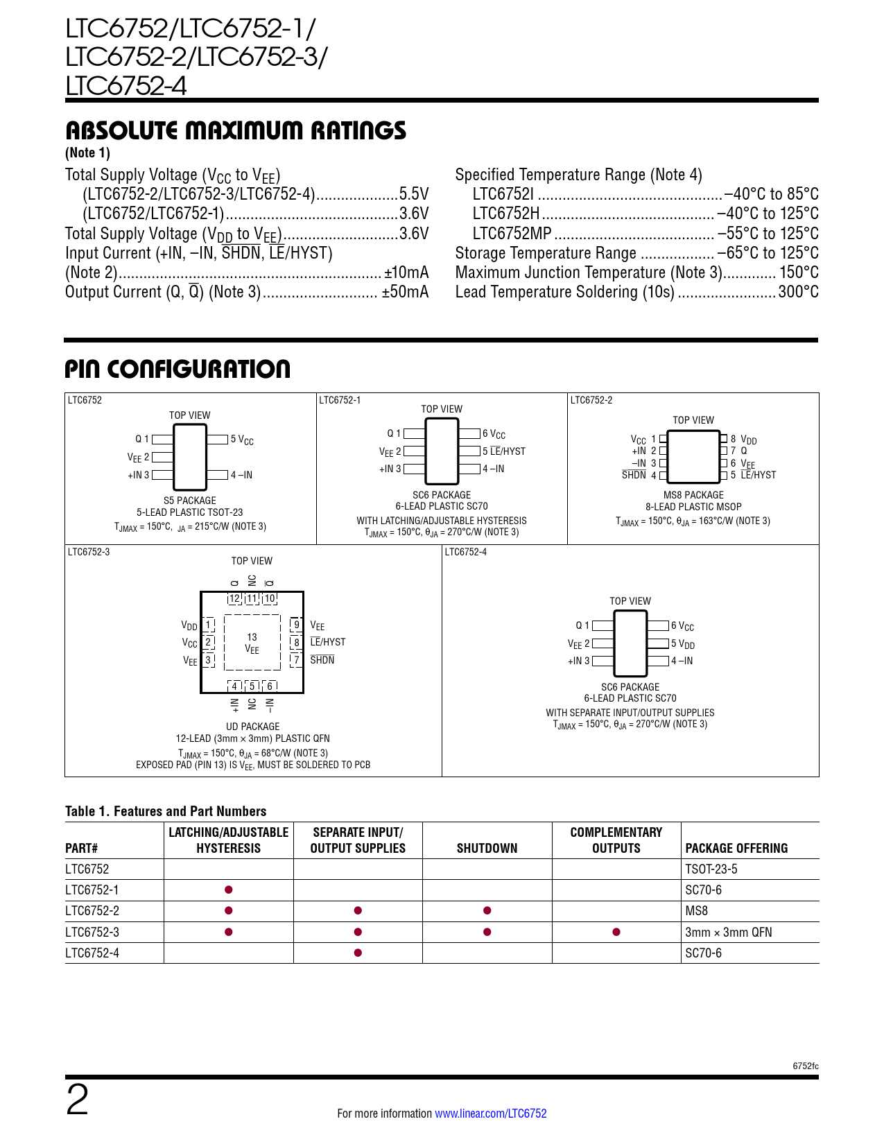 LTC6752/LTC6752-1/ LTC6752-2/LTC6752-3/ LTC6752-4 absoluTe MaxiMuM raTings(Note 1) Total Supply Voltage (VCC to VEE) Specified Temperature Range (Note 4) (LTC6752-2/LTC6752-3/LTC6752-4) ..5.5V LTC6752I ...–40°C to 85°C (LTC6752/LTC6752-1) ..3.6V LTC6752H .. –40°C to 125°C Total Supply Voltage (VDD to VEE) ..3.6V LTC6752MP ... –55°C to 125°C Input Current (+IN, –IN, SHDN, LE/HYST) Storage Temperature Range .. –65°C to 125°C (Note 2) .. ±10mA Maximum Junction Temperature (Note 3)... 150°C Output Current (Q, Q) (Note 3) .. ±50mA Lead Temperature Soldering (10s) ..300°C pin conFiguraTion LTC6752 LTC6752-1 LTC6752-2 TOP VIEW TOP VIEW TOP VIEW Q 1 5 V Q 1 6 VCC CC VCC 1 8 VDD V VEE 2 5 LE/HYST +IN 2 7 Q EE 2 –IN 3 6 VEE +IN +IN 3 4 –IN 3 4 –IN SHDN 4 5 LE/HYST S5 PACKAGE SC6 PACKAGE MS8 PACKAGE 5-LEAD PLASTIC TSOT-23 6-LEAD PLASTIC SC70 8-LEAD PLASTIC MSOP T WITH LATCHING/ADJUSTABLE HYSTERESIS TJMAX = 150°C, θJA = 163°C/W (NOTE 3) JMAX = 150°C, JA = 215°C/W (NOTE 3) TJMAX = 150°C, θJA = 270°C/W (NOTE 3) LTC6752-3 LTC6752-4 TOP VIEW Q NC Q 12 11 10 TOP VIEW VDD 1 9 VEE Q 1 6 VCC 13 VCC 2 V 8 LE/HYST V 5 V EE EE 2 DD VEE 3 7 SHDN +IN 3 4 –IN 4 5 6 SC6 PACKAGE 6-LEAD PLASTIC SC70 +IN NC –IN WITH SEPARATE INPUT/OUTPUT SUPPLIES UD PACKAGE TJMAX = 150°C, θJA = 270°C/W (NOTE 3) 12-LEAD (3mm × 3mm) PLASTIC QFN TJMAX = 150°C, θJA = 68°C/W (NOTE 3) EXPOSED PAD (PIN 13) IS VEE, MUST BE SOLDERED TO PCB Table 1. Features and Part NumbersLATCHING/ADJUSTABLESEPARATE INPUT/COMPLEMENTARYPART#HYSTERESISOUTPUT SUPPLIESSHUTDOWNOUTPUTSPACKAGE OFFERING LTC6752 TSOT-23-5 LTC6752-1 l SC70-6 LTC6752-2 l l l MS8 LTC6752-3 l l l l 3mm × 3mm QFN LTC6752-4 l SC70-6 6752fc 2 For more information www.linear.com/LTC6752 Document Outline Features Applications Typical Application Description Absolute Maximum Ratings Pin Configuration Order Information Electrical Characteristics Typical Performance Characteristics DC Typical Performance Characteristics AC Pin Functions Block Diagram Applications Information Typical Applications Package Description Revision History Typical Application Related Parts