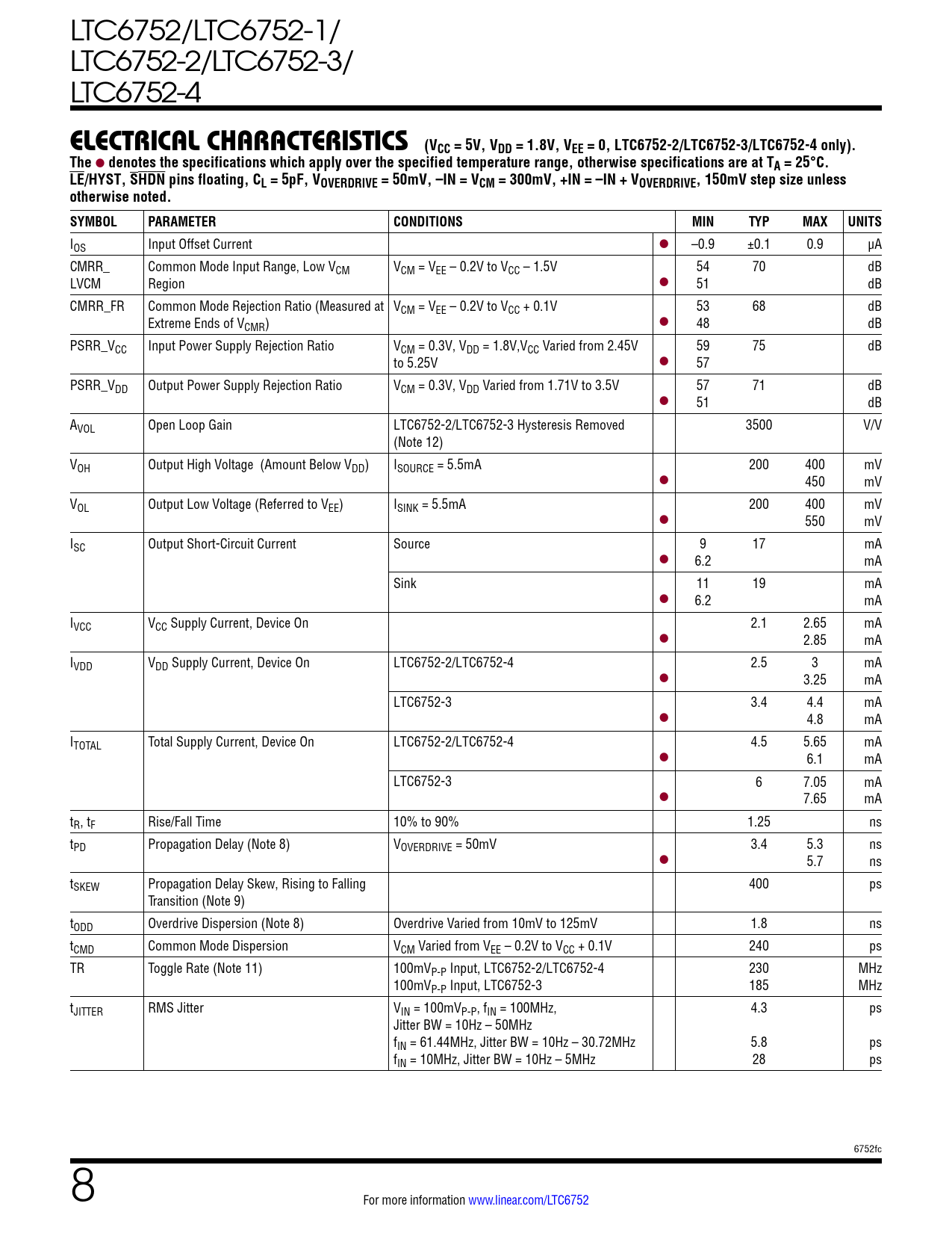 LTC6752/LTC6752-1/ LTC6752-2/LTC6752-3/ LTC6752-4 elecTrical characTerisTics(VCC = 5V, VDD = 1.8V, VEE = 0, LTC6752-2/LTC6752-3/LTC6752-4 only).The l denotes the specifications which apply over the specified temperature range, otherwise specifications are at TA = 25°C.LE/HYST, SHDN pins floating, CL = 5pF, VOVERDRIVE = 50mV, –IN = VCM = 300mV, +IN = –IN + VOVERDRIVE, 150mV step size unlessotherwise noted. SYMBOLPARAMETERCONDITIONSMINTYPMAXUNITS IOS Input Offset Current l –0.9 ±0.1 0.9 µA CMRR_ Common Mode Input Range, Low VCM VCM = VEE – 0.2V to VCC – 1.5V 54 70 dB LVCM Region l 51 dB CMRR_FR Common Mode Rejection Ratio (Measured at VCM = VEE – 0.2V to VCC + 0.1V 53 68 dB Extreme Ends of VCMR) l 48 dB PSRR_VCC Input Power Supply Rejection Ratio VCM = 0.3V, VDD = 1.8V,VCC Varied from 2.45V 59 75 dB to 5.25V l 57 PSRR_VDD Output Power Supply Rejection Ratio VCM = 0.3V, VDD Varied from 1.71V to 3.5V 57 71 dB l 51 dB AVOL Open Loop Gain LTC6752-2/LTC6752-3 Hysteresis Removed 3500 V/V (Note 12) VOH Output High Voltage (Amount Below VDD) ISOURCE = 5.5mA 200 400 mV l 450 mV VOL Output Low Voltage (Referred to VEE) ISINK = 5.5mA 200 400 mV l 550 mV ISC Output Short-Circuit Current Source 9 17 mA l 6.2 mA Sink 11 19 mA l 6.2 mA IVCC VCC Supply Current, Device On 2.1 2.65 mA l 2.85 mA IVDD VDD Supply Current, Device On LTC6752-2/LTC6752-4 2.5 3 mA l 3.25 mA LTC6752-3 3.4 4.4 mA l 4.8 mA ITOTAL Total Supply Current, Device On LTC6752-2/LTC6752-4 4.5 5.65 mA l 6.1 mA LTC6752-3 6 7.05 mA l 7.65 mA tR, tF Rise/Fall Time 10% to 90% 1.25 ns tPD Propagation Delay (Note 8) VOVERDRIVE = 50mV 3.4 5.3 ns l 5.7 ns tSKEW Propagation Delay Skew, Rising to Falling 400 ps Transition (Note 9) tODD Overdrive Dispersion (Note 8) Overdrive Varied from 10mV to 125mV 1.8 ns tCMD Common Mode Dispersion VCM Varied from VEE – 0.2V to VCC + 0.1V 240 ps TR Toggle Rate (Note 11) 100mVP-P Input, LTC6752-2/LTC6752-4 230 MHz 100mVP-P Input, LTC6752-3 185 MHz tJITTER RMS Jitter VIN = 100mVP-P, fIN = 100MHz, 4.3 ps Jitter BW = 10Hz – 50MHz fIN = 61.44MHz, Jitter BW = 10Hz – 30.72MHz 5.8 ps fIN = 10MHz, Jitter BW = 10Hz – 5MHz 28 ps 6752fc 8 For more information www.linear.com/LTC6752 Document Outline Features Applications Typical Application Description Absolute Maximum Ratings Pin Configuration Order Information Electrical Characteristics Typical Performance Characteristics DC Typical Performance Characteristics AC Pin Functions Block Diagram Applications Information Typical Applications Package Description Revision History Typical Application Related Parts