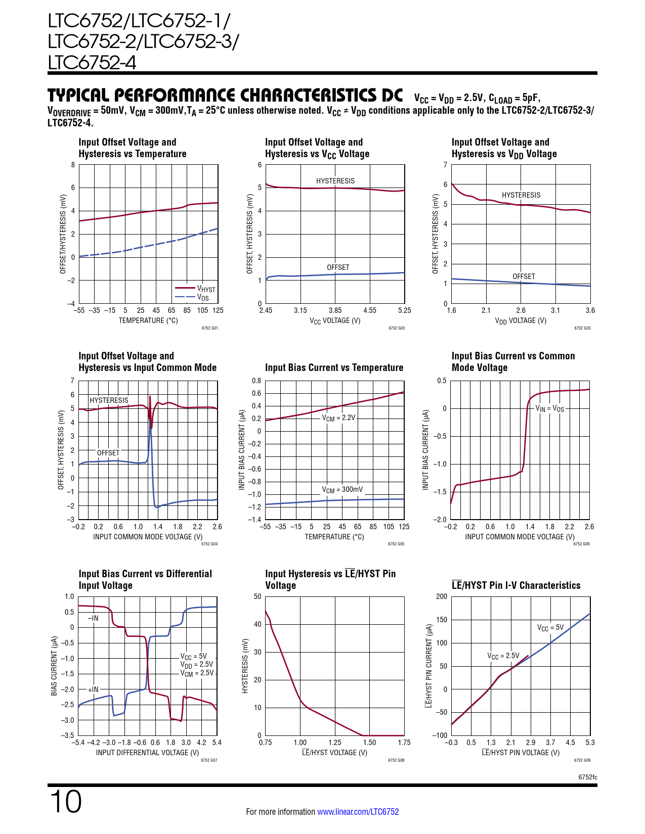 Typical perForMance characTerisTics Dc VCC = VDD = 2.5V, CLOAD = 5pF, VOVERDRIVE = 50mV, VCM = 300mV,TA = 25°C unless otherwise noted. VCC ≠ VDD conditions applicable only to the LTC6752-2/LTC6752-3/ LTC6752-4. Input Offset Voltage and Input Offset Voltage and Input Offset Voltage and Hysteresis vs Temperature Hysteresis vs VCC Voltage Hysteresis vs VDD Voltage