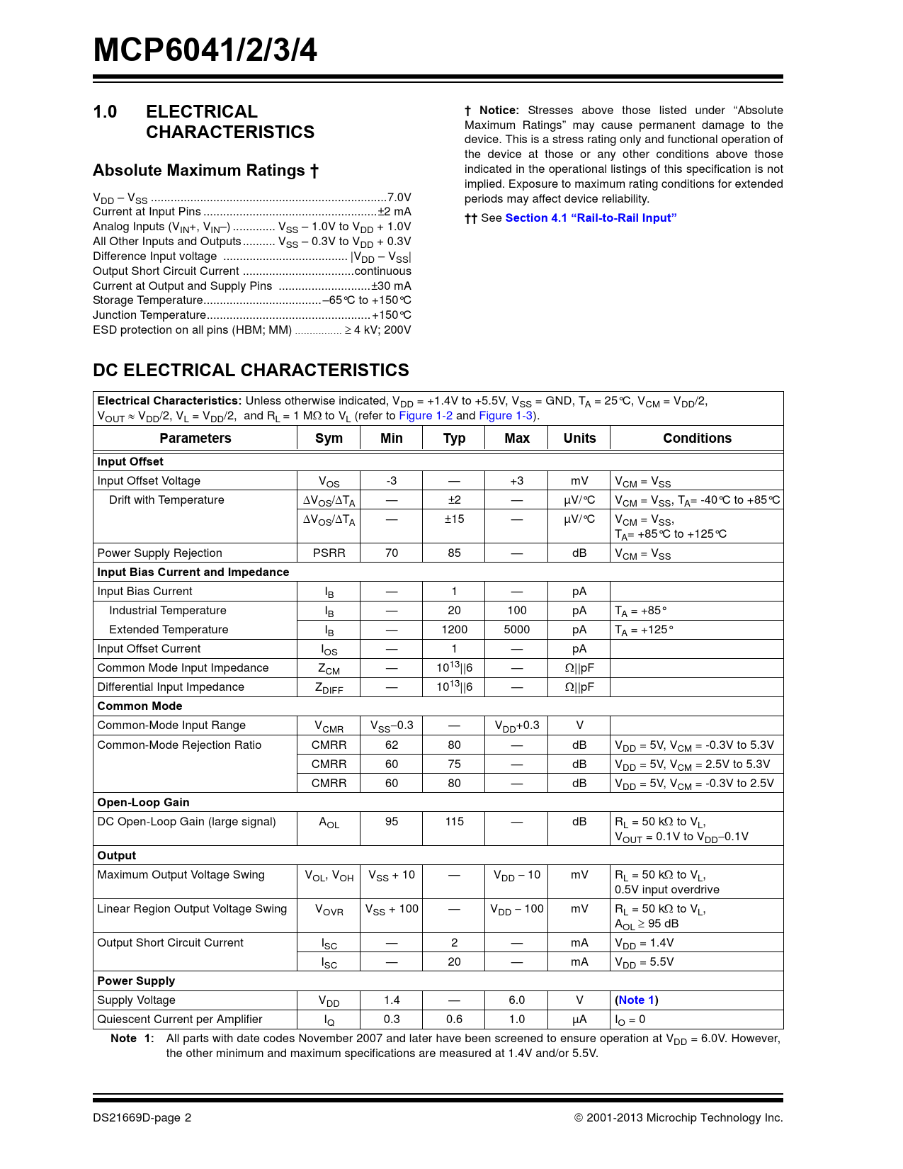 MCP6041/2/3/4. 1.0. ELECTRICAL. † Notice:. CHARACTERISTICS. Absolute Maximum Ratings †. Section 4.1 “Rail-to-Rail Input”