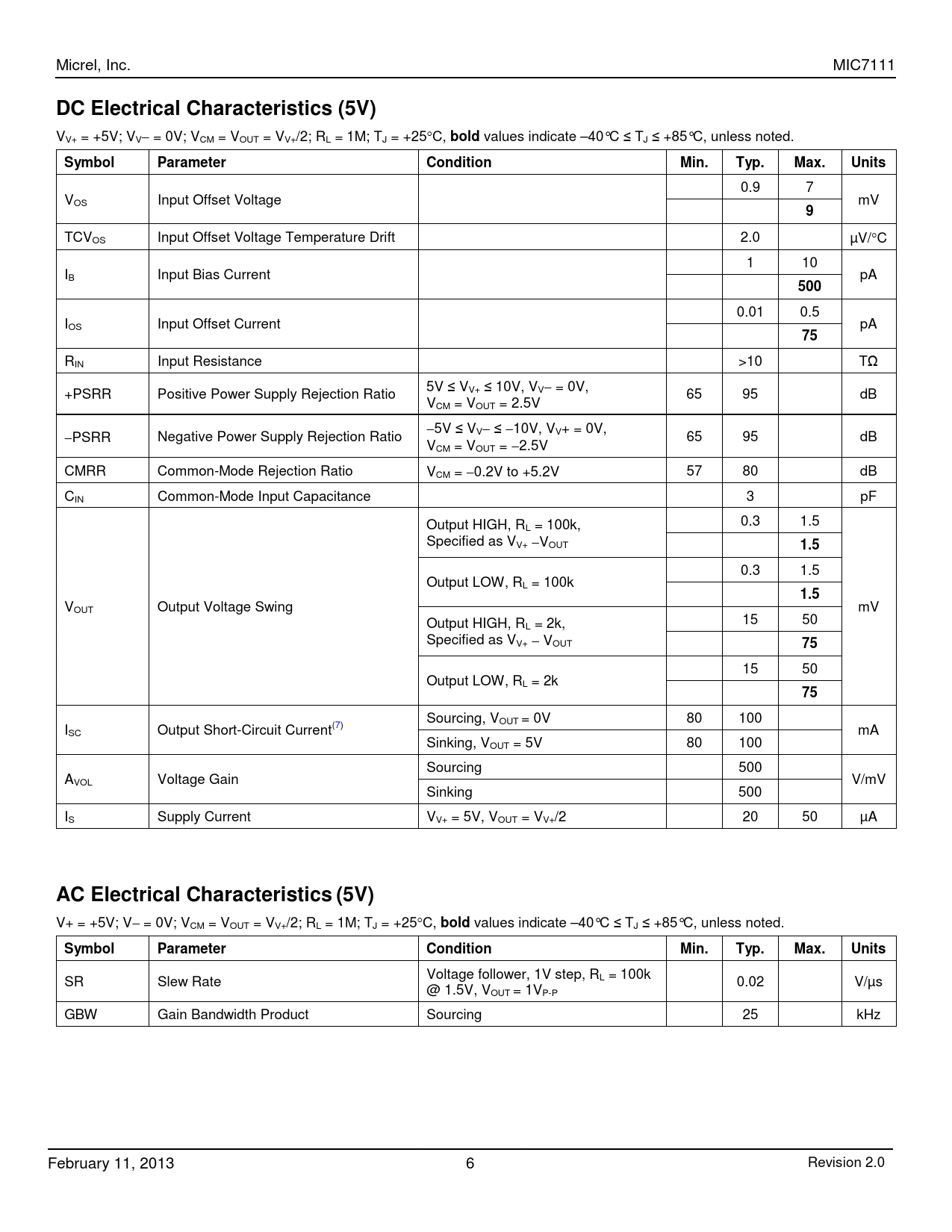 | 页数 / 页 | 12 / 6 — Micrel, Inc. MIC7111 DC Electrical Characteristics (5V) |