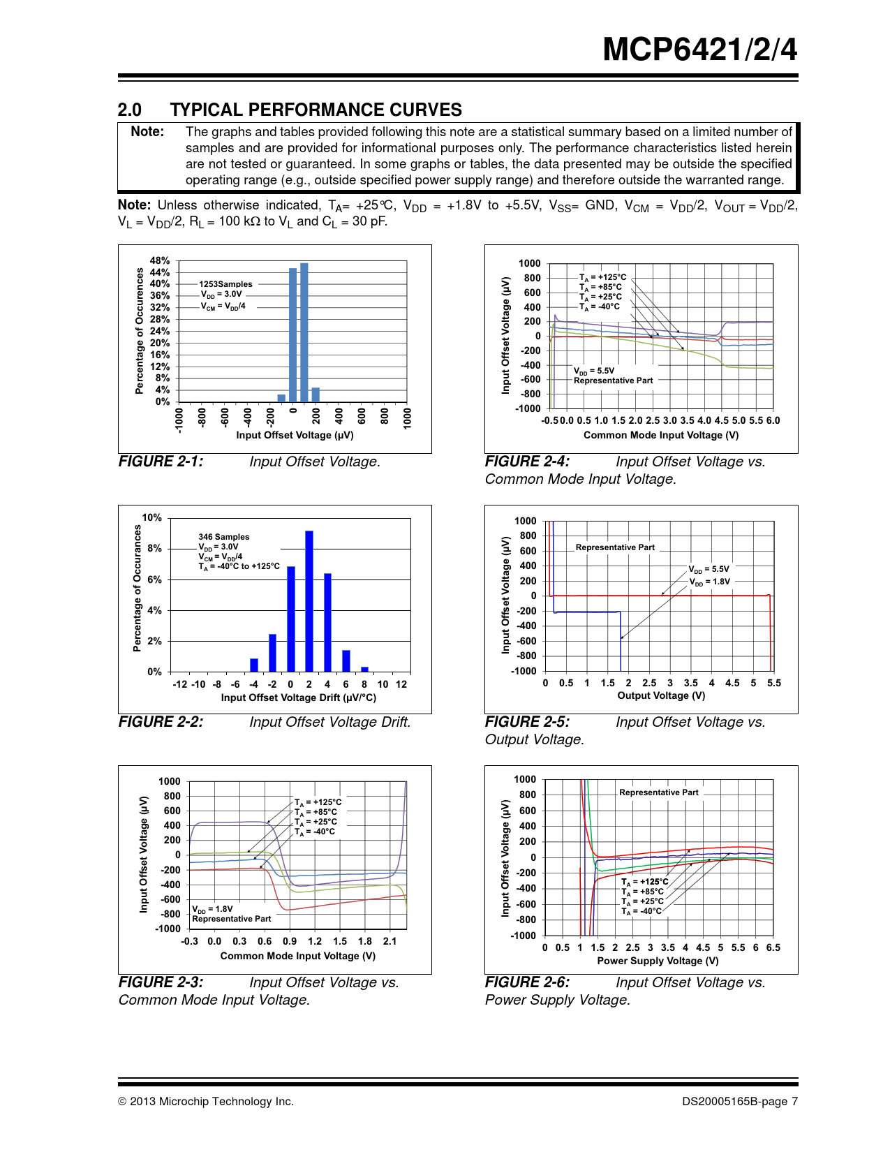 MCP6421/2/42.0TYPICAL PERFORMANCE CURVESNote: The graphs and tables provided following this note are a statistical summary based on a limited number of samples and are provided for informational purposes only. The performance characteristics listed herein are not tested or guaranteed. In some graphs or tables, the data presented may be outside the specified operating range (e.g., outside specified power supply range) and therefore outside the warranted range. Note: Unless otherwise indicated, TA= +25°C, VDD = +1.8V to +5.5V, VSS= GND, VCM = VDD/2, VOUT = VDD/2, VL = VDD/2, RL = 100 k to VL and CL = 30 pF. 48%100044%800T = +125°C40%A1253SamplesT = +85°CA36%V= 3.0V(μV)600DDT = +25°CA32%V= V/4CMDD400T = -40°CA28%ltage200o24%020% 16%-200ntage of Occurences 12%e-400t Offset VV= 5 5. V5VDD8%-600Representative PartPerc4%Inpu-8000%0-1000-800-600-400-200200400600800-0.5 0.0 0.5 1.0 1.5 2.0 2.5 3.0 3.5 4.0 4.5 5.0 5.5 6.0-10001000Input Offset Voltage (μV)Common Mode Input Voltage (V)FIGURE 2-1: Input Offset Voltage. FIGURE 2-4: Input Offset Voltage vs. Common Mode Input Voltage. 10%1000346 Samples8008%V= 3.0VDDRepresentative Part(μV)600V= V/4CMDDT = -40°C to +125°C400AV= 5.5VDD6%ltage200oV= 1.8VDD04%-200-400t Offset V2%-600Percentage of OccurancesInpu -8000%-1000-12 -10 -8-6-4-20246810 1200.511.522.533.544.555.5Input Offset Voltage Drift (μV/°C)Output Voltage (V)FIGURE 2-2: Input Offset Voltage Drift. FIGURE 2-5: Input Offset Voltage vs. Output Voltage. 10001000800800Representative PartT = +125°CA(μV)600T = +85°C600A400T = +25°CA400T = -40°CltageA200oltage (μV)200o00-200-200-400T = +125°C125 Ct Offset VOffset VAO -400T = +85°CA-600-600T = +25°CAInpuV= 1.8V-800DDInputT = -40°CARepresentative Part-800-1000-1000-0.3 0.00.30.60.91.21.51.82.10 0.5 1 1.5 2 2.5 3 3.5 4 4.5 5 5.5 6 6.5Common Mode Input Voltage (V)Power Supply Voltage (V)FIGURE 2-3: Input Offset Voltage vs. FIGURE 2-6: Input Offset Voltage vs. Common Mode Input Voltage. Power Supply Voltage. 2013 Microchip Technology Inc. DS20005165B-page 7 Document Outline Typical Application Package Types 1.0 Electrical Characteristics 1.1 Absolute Maximum Ratings † 1.2 Specifications TABLE 1-1: DC electrical specifications TABLE 1-2: AC Electrical Specifications TABLE 1-3: Temperature Specifications 1.3 Test Circuits FIGURE 1-1: AC and DC Test Circuit for Most Specifications. 2.0 Typical Performance Curves FIGURE 2-1: Input Offset Voltage. FIGURE 2-2: Input Offset Voltage Drift. FIGURE 2-3: Input Offset Voltage vs. Common Mode Input Voltage. FIGURE 2-4: Input Offset Voltage vs. Common Mode Input Voltage. FIGURE 2-5: Input Offset Voltage vs. Output Voltage. FIGURE 2-6: Input Offset Voltage vs. Power Supply Voltage. FIGURE 2-7: Input Noise Voltage Density vs. Common Mode Input Voltage. FIGURE 2-8: Input Noise Voltage Density vs. Frequency. FIGURE 2-9: CMRR, PSRR vs. Frequency. FIGURE 2-10: CMRR, PSRR vs. Ambient Temperature. FIGURE 2-11: Input Bias, Offset Current vs. Ambient Temperature. FIGURE 2-12: Input Bias Current vs. Common Mode Input Voltage. FIGURE 2-13: Quiescent Current vs. Ambient Temperature. FIGURE 2-14: Quiescent Current vs. Power Supply Voltage. FIGURE 2-15: Quiescent Current vs. Common Mode Input Voltage. FIGURE 2-16: Quiescent Current vs. Common Mode Input Voltage. FIGURE 2-17: Open-Loop Gain, Phase vs. Frequency. FIGURE 2-18: DC Open-Loop Gain vs. Ambient Temperature. FIGURE 2-19: DC Open-Loop Gain vs. Output Voltage Headroom. FIGURE 2-20: Gain Bandwidth Product, Phase Margin vs. Ambient Temperature. FIGURE 2-21: Gain Bandwidth Product, Phase Margin vs. Ambient Temperature. FIGURE 2-22: Output Short Circuit Current vs. Power Supply Voltage. FIGURE 2-23: Output Voltage Swing vs. Frequency. FIGURE 2-24: Output Voltage Headroom vs. Output Current. FIGURE 2-25: Output Voltage Headroom vs. Output Current. FIGURE 2-26: Output Voltage Headroom vs. Ambient Temperature. FIGURE 2-27: Output Voltage Headroom vs. Ambient Temperature. FIGURE 2-28: Slew Rate vs. Ambient Temperature. FIGURE 2-29: Small Signal Non-Inverting Pulse Response. FIGURE 2-30: Small Signal Inverting Pulse Response. FIGURE 2-31: Large Signal Non-Inverting Pulse Response. FIGURE 2-32: Large Signal Inverting Pulse Response. FIGURE 2-33: The MCP6421/2/4 Device Shows No Phase Reversal. FIGURE 2-34: Closed Loop Output Impedance vs. Frequency. FIGURE 2-35: Measured Input Current vs. Input Voltage (below VSS). FIGURE 2-36: EMIRR vs. Frequency. FIGURE 2-37: EMIRR vs. RF Input Peak- to-Peak Voltage. FIGURE 2-38: Channel-to-Channel Separation vs. Frequency. 3.0 Pin Descriptions TABLE 3-1: Pin Function Table 3.1 Analog Outputs 3.2 Analog Inputs 3.3 Power Supply Pins (VSS, VDD) 4.0 Application Information 4.1 Rail-to-Rail Input FIGURE 4-1: Simplified Analog Input ESD Structures. FIGURE 4-2: Protecting the Analog Inputs. FIGURE 4-3: Protecting the Analog Inputs. 4.2 Rail-to-Rail Output 4.3 Capacitive Loads FIGURE 4-4: Output Resistor, RISO Stabilizes Large Capacitive Loads. FIGURE 4-5: Recommended RISO Values for Capacitive Loads. 4.4 Supply Bypass 4.5 Unused Op Amps FIGURE 4-6: Unused Op Amps. 4.6 PCB Surface Leakage FIGURE 4-7: Example Guard Ring Layout for Inverting Gain. 4.7 Electromagnetic Interference Rejection Ratio (EMIRR) Definitions 4.8 Application Circuits FIGURE 4-8: CO Gas Sensor Circuit. FIGURE 4-9: Pressure Sensor Amplifier. FIGURE 4-10: Battery Current Sensing. 5.0 Design Aids 5.1 SPICE Macro Model 5.2 FilterLab® Software 5.3 Microchip Advanced Part Selector (MAPS) 5.4 Analog Demonstration and Evaluation Boards 5.5 Application Notes 6.0 Packaging Information 6.1 Package Marking Information Appendix A: Revision History Product Identification System Trademarks Worldwide Sales and Service