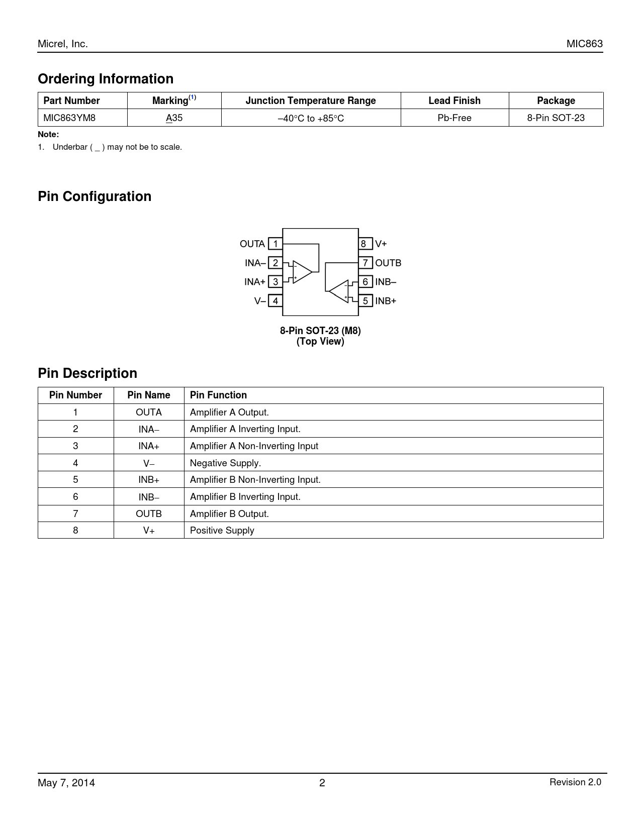(1) Part Number Marking MIC863YM8 Junction Temperature Range Lead Finish Package –40°C to +85°C Pb-Free 8-Pin SOT-23 A35 Note: