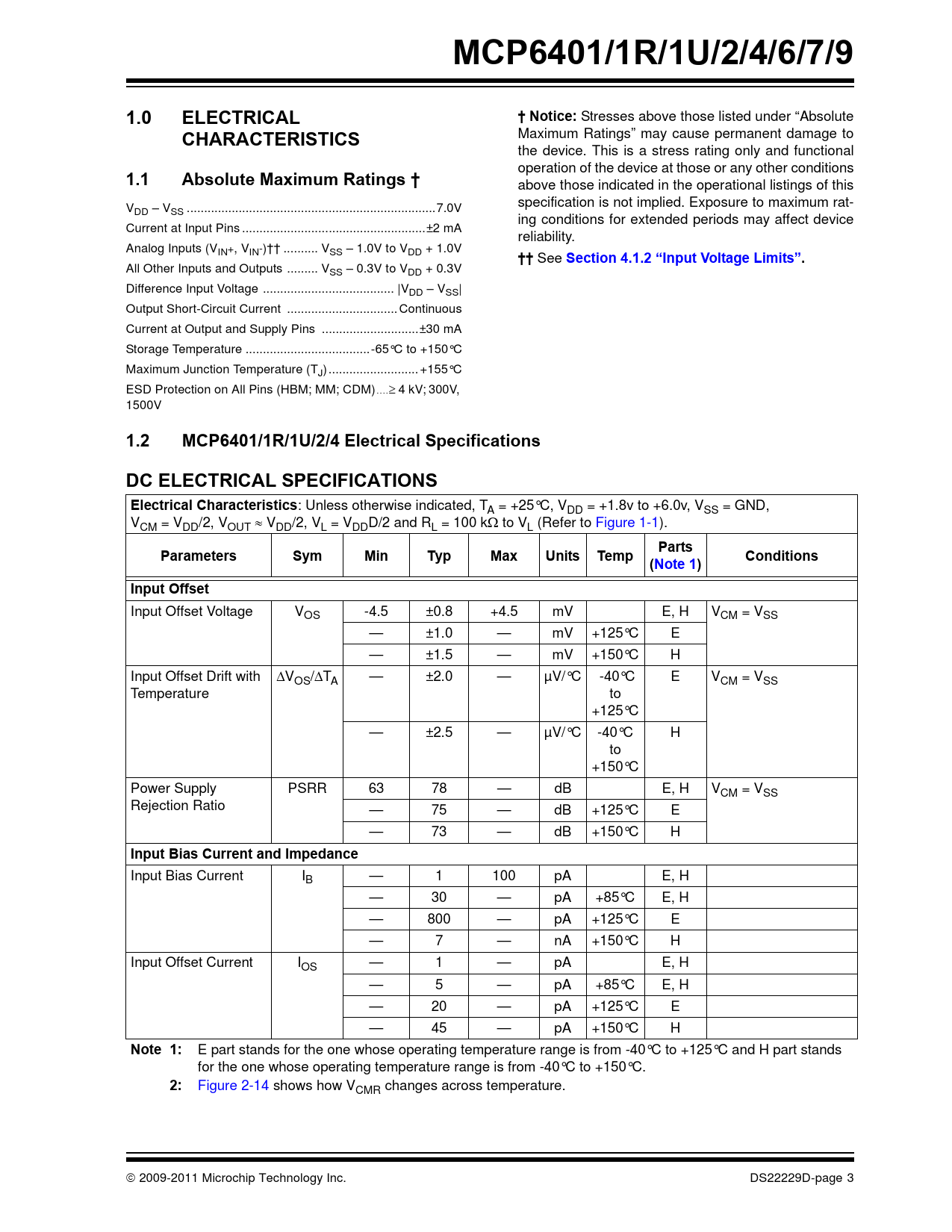 MCP6401/1R/1U/2/4/6/7/9. 1.0. ELECTRICAL. † Notice:. CHARACTERISTICS. 1.1. Absolute Maximum Ratings †
