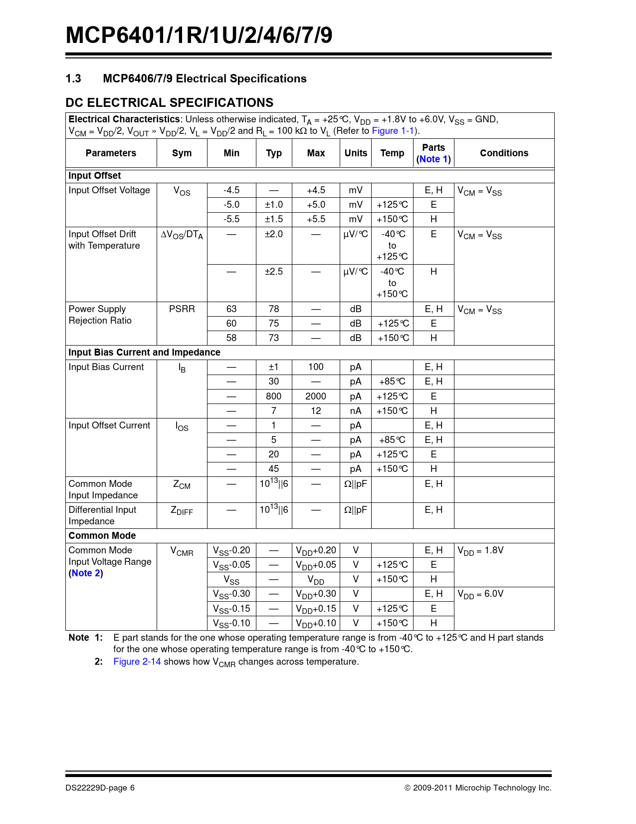 MCP6401/1R/1U/2/4/6/7/9. 1.3. MCP6406/7/9 Electrical Specifications. DC ELECTRICAL SPECIFICATIONS. Electrical Characteristics