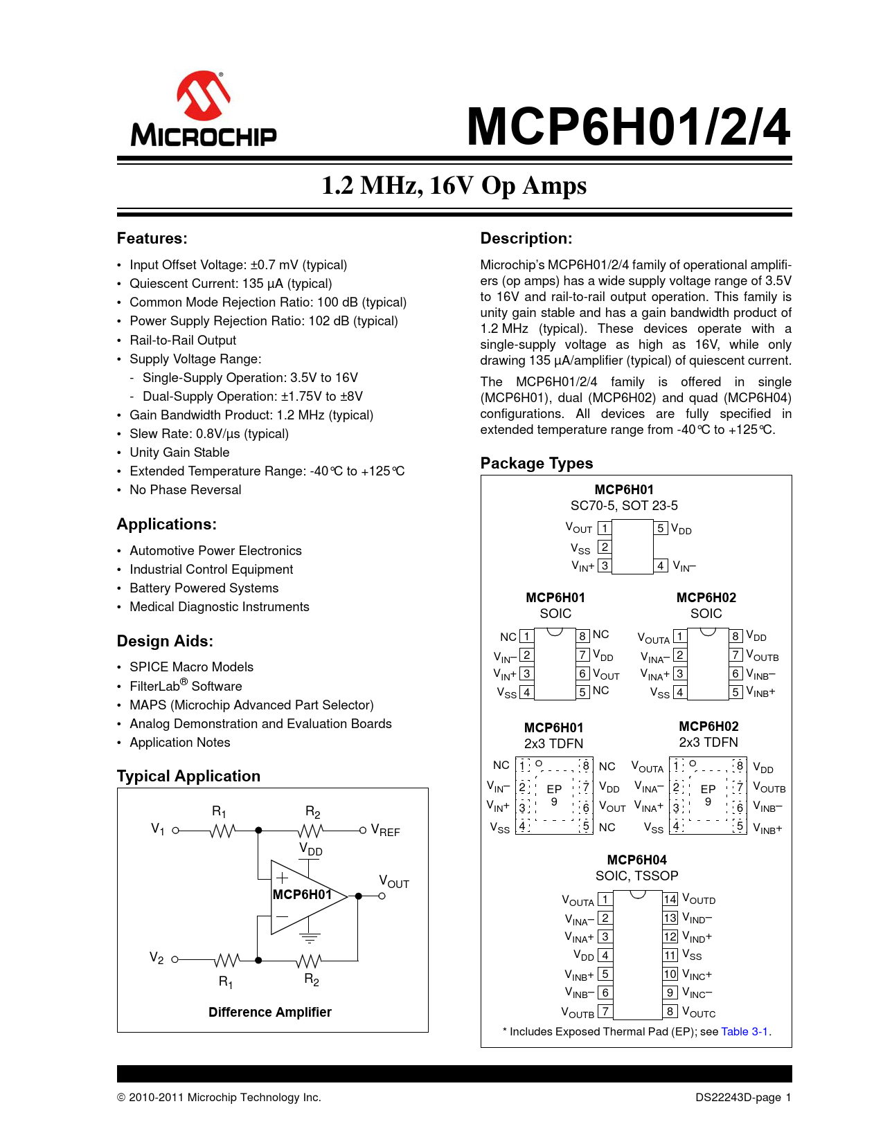 link to page 15 MCP6H01/2/41.2 MHz, 16V Op AmpsFeatures:Description: • Input Offset Voltage: ±0.7 mV (typical) Microchip’s MCP6H01/2/4 family of operational amplifi- • Quiescent Current: 135 µA (typical) ers (op amps) has a wide supply voltage range of 3.5V • Common Mode Rejection Ratio: 100 dB (typical) to 16V and rail-to-rail output operation. This family is unity gain stable and has a gain bandwidth product of • Power Supply Rejection Ratio: 102 dB (typical) 1.2 MHz (typical). These devices operate with a • Rail-to-Rail Output single-supply voltage as high as 16V, while only • Supply Voltage Range: drawing 135 µA/amplifier (typical) of quiescent current. - Single-Supply Operation: 3.5V to 16V The MCP6H01/2/4 family is offered in single - Dual-Supply Operation: ±1.75V to ±8V (MCP6H01), dual (MCP6H02) and quad (MCP6H04) • Gain Bandwidth Product: 1.2 MHz (typical) configurations. All devices are fully specified in • Slew Rate: 0.8V/µs (typical) extended temperature range from -40°C to +125°C. • Unity Gain Stable Package Types • Extended Temperature Range: -40°C to +125°C • No Phase Reversal MCP6H01 SC70-5, SOT 23-5 Applications: VOUT 1 5 VDD • Automotive Power Electronics V 2 SS • Industrial Control Equipment VIN+ 3 4 VIN– • Battery Powered Systems MCP6H01MCP6H02 • Medical Diagnostic Instruments SOIC SOIC Design Aids: NC 1 8 NC V 1 8 V OUTA DD V 2 7 VDD V 2 7 V IN– INA– OUTB • SPICE Macro Models V 3 6 V V IN+ OUT INA+ 3 6 VINB– • FilterLab® Software V 4 5 NC V V SS SS 4 5 INB+ • MAPS (Microchip Advanced Part Selector) • Analog Demonstration and Evaluation Boards MCP6H01MCP6H02 • Application Notes 2x3 TDFN 2x3 TDFN NC 1 8 NC V 1 8 OUTA V Typical Application DD VIN– 2 EP 7 VDD VINA– 2 EP 7 VOUTB 9 V 9 V R IN+ 3 6 VOUT INA+ 3 6 VINB– 1 R2 V V V 4 5 NC V 4 5 V 1 REF SS SS INB+ VDD MCP6H04 V SOIC, TSSOP OUT MCP6H01 V 1 14 V OUTA OUTD V 2 13 V INA– IND– VINA+ 3 12 VIND+ V V 4 11 V 2 DD SS V R R INB+ 5 10 VINC+ 1 2 VINB– 6 9 VINC– Difference Amplifier VOUTB 7 8 VOUTC * Includes Exposed Thermal Pad (EP); see Table 3-1. 2010-2011 Microchip Technology Inc. DS22243D-page 1 Document Outline 1.0 Electrical Characteristics 1.1 Absolute Maximum Ratings † 1.2 Test Circuits FIGURE 1-1: AC and DC Test Circuit for Most Specifications. 2.0 Typical Performance Curves FIGURE 2-1: Input Offset Voltage. FIGURE 2-2: Input Offset Voltage Drift. FIGURE 2-3: Input Offset Voltage vs. Common Mode Input Voltage. FIGURE 2-4: Input Offset Voltage vs. Common Mode Input Voltage. FIGURE 2-5: Input Offset Voltage vs. Common Mode Input Voltage. FIGURE 2-6: Input Offset Voltage vs. Output Voltage. FIGURE 2-7: Input Offset Voltage vs. Power Supply Voltage. FIGURE 2-8: Input Noise Voltage Density vs. Frequency. FIGURE 2-9: Input Noise Voltage Density vs. Common Mode Input Voltage. FIGURE 2-10: CMRR, PSRR vs. Frequency. FIGURE 2-11: CMRR, PSRR vs. Ambient Temperature. FIGURE 2-12: Input Bias, Offset Currents vs. Ambient Temperature. FIGURE 2-13: Input Bias Current vs. Common Mode Input Voltage. FIGURE 2-14: Quiescent Current vs. Ambient Temperature. FIGURE 2-15: Quiescent Current vs. Power Supply Voltage. FIGURE 2-16: Open-Loop Gain, Phase vs. Frequency. FIGURE 2-17: DC Open-Loop Gain vs. Power Supply Voltage. FIGURE 2-18: DC Open-Loop Gain vs. Output Voltage Headroom. FIGURE 2-19: Channel-to-Channel Separation vs. Frequency (MCP6H02 only). FIGURE 2-20: Gain Bandwidth Product, Phase Margin vs. Ambient Temperature. FIGURE 2-21: Gain Bandwidth Product, Phase Margin vs. Ambient Temperature. FIGURE 2-22: Output Short Circuit Current vs. Power Supply Voltage. FIGURE 2-23: Output Voltage Swing vs. Frequency. FIGURE 2-24: Output Voltage Headroom vs. Output Current. FIGURE 2-25: Output Voltage Headroom vs. Output Current. FIGURE 2-26: Output Voltage Headroom vs. Output Current. FIGURE 2-27: Output Voltage Headroom vs. Ambient Temperature. FIGURE 2-28: Output Voltage Headroom vs. Ambient Temperature. FIGURE 2-29: Output Voltage Headroom vs. Ambient Temperature. FIGURE 2-30: Slew Rate vs. Ambient Temperature. FIGURE 2-31: Slew Rate vs. Ambient Temperature. FIGURE 2-32: Small Signal Non-Inverting Pulse Response. FIGURE 2-33: Small Signal Inverting Pulse Response. FIGURE 2-34: Large Signal Non-Inverting Pulse Response. FIGURE 2-35: Large Signal Inverting Pulse Response. FIGURE 2-36: The MCP6H01/2/4 Shows No Phase Reversal. FIGURE 2-37: Closed Loop Output Impedance vs. Frequency. FIGURE 2-38: Measured Input Current vs. Input Voltage (below VSS). 3.0 Pin Descriptions TABLE 3-1: Pin Function Table 3.1 Analog Outputs 3.2 Analog Inputs 3.3 Power Supply Pins 3.4 Exposed Thermal Pad (EP) 4.0 Application Information 4.1 Inputs FIGURE 4-1: Simplified Analog Input ESD Structures. FIGURE 4-2: Protecting the Analog Inputs. FIGURE 4-3: Protecting the Analog Inputs. 4.2 Rail-to-Rail Output 4.3 Capacitive Loads FIGURE 4-4: Output Resistor, RISO Stabilizes Large Capacitive Loads. FIGURE 4-5: Recommended RISO Values for Capacitive Loads. 4.4 Supply Bypass 4.5 Unused Op Amps FIGURE 4-6: Unused Op Amps. 4.6 PCB Surface Leakage FIGURE 4-7: Example Guard Ring Layout for Inverting Gain. 4.7 Application Circuits FIGURE 4-8: High Side Current Sensing Using Difference Amplifier. FIGURE 4-9: Two Op Amp Instrumentation Amplifier. FIGURE 4-10: Photodetector Amplifier. 5.0 Design Aids 5.1 SPICE Macro Model 5.2 FilterLab Software 5.3 MAPS (Microchip Advanced Part Selector) 5.4 Analog Demonstration and Evaluation Boards 5.5 Application Notes 6.0 Packaging Information 6.1 Package Marking Information Corporate Office Atlanta Boston Chicago Cleveland Fax: 216-447-0643 Dallas Detroit Indianapolis Toronto Fax: 852-2401-3431 Australia - Sydney China - Beijing China - Shanghai India - Bangalore Korea - Daegu Korea - Seoul Singapore Taiwan - Taipei Fax: 43-7242-2244-393 Denmark - Copenhagen France - Paris Germany - Munich Italy - Milan Spain - Madrid UK - Wokingham Worldwide Sales and Service