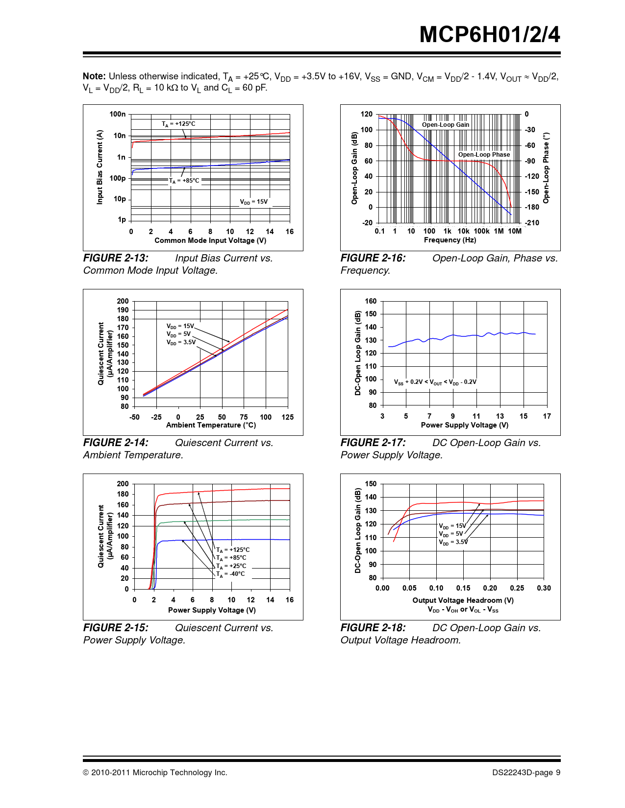 MCP6H01/2/4Note: Unless otherwise indicated, T A = +25°C, VDD = +3.5V to +16V, VSS = GND, VCM = VDD/2 - 1.4V, VOUT VDD/2, VL = VDD/2, RL = 10 kto VL and CL = 60 pF. 10001 0000n1200TOpen-Loop Gain)A = +125°C100-301000010n) Bt (A(d 80-60e (°) asrren 10001nainOpen-Loop Phaseh60-90Pp Gpas Cuo101000po 40-120ooTA = +85°C-Lt Bi-Luen 20-150enp10pIn10pVDD = 15VOpO0-18011p-20-21002468101214161.0E-011.0E+00 1.0E+01 1.0E+02 1.0E+03 1.0E+04 1.0E+05 1.0E+06 1.0E+070.1 1 10 100 1k 10k 100k 1M 10MCommon Mode Input Voltage (V)Frequency (Hz)FIGURE 2-13: Input Bias Current vs. FIGURE 2-16: Open-Loop Gain, Phase vs. Common Mode Input Voltage. Frequency. 200160190) B 150180td170(en140rrr)VDD = 15V160VDD = 5Vainuie130lif 150VDD = 3.5VGt Cpp140om120/A 130110iescen120en Lou(µAp110Q100-OVSS + 0.2V < VOUT < VDD - 0.2V100C D9090 8080-50-250255075100125357911131517Ambient Temperature (°C)Power Supply Voltage (V)FIGURE 2-14: Quiescent Current vs. FIGURE 2-17: DC Open-Loop Gain vs. Ambient Temperature. Power Supply Voltage. 200150180B) 140t160(d130r) 140ainrren uieG120lifp 120VDD = 15Vt Cpon100oVm110LDD = 5V/AV80DD = 3.5VTen p 100iesceA = +125°C(µA60uTA = +85°COQ40T90A = +25°CTDC-20A = -40°C8000.000.050.100.150.200.250.300246810121416Output Voltage Headroom (V)Power Supply Voltage (V)VDD - VOH or VOL - VSSFIGURE 2-15: Quiescent Current vs. FIGURE 2-18: DC Open-Loop Gain vs. Power Supply Voltage. Output Voltage Headroom. 2010-2011 Microchip Technology Inc. DS22243D-page 9 Document Outline 1.0 Electrical Characteristics 1.1 Absolute Maximum Ratings † 1.2 Test Circuits FIGURE 1-1: AC and DC Test Circuit for Most Specifications. 2.0 Typical Performance Curves FIGURE 2-1: Input Offset Voltage. FIGURE 2-2: Input Offset Voltage Drift. FIGURE 2-3: Input Offset Voltage vs. Common Mode Input Voltage. FIGURE 2-4: Input Offset Voltage vs. Common Mode Input Voltage. FIGURE 2-5: Input Offset Voltage vs. Common Mode Input Voltage. FIGURE 2-6: Input Offset Voltage vs. Output Voltage. FIGURE 2-7: Input Offset Voltage vs. Power Supply Voltage. FIGURE 2-8: Input Noise Voltage Density vs. Frequency. FIGURE 2-9: Input Noise Voltage Density vs. Common Mode Input Voltage. FIGURE 2-10: CMRR, PSRR vs. Frequency. FIGURE 2-11: CMRR, PSRR vs. Ambient Temperature. FIGURE 2-12: Input Bias, Offset Currents vs. Ambient Temperature. FIGURE 2-13: Input Bias Current vs. Common Mode Input Voltage. FIGURE 2-14: Quiescent Current vs. Ambient Temperature. FIGURE 2-15: Quiescent Current vs. Power Supply Voltage. FIGURE 2-16: Open-Loop Gain, Phase vs. Frequency. FIGURE 2-17: DC Open-Loop Gain vs. Power Supply Voltage. FIGURE 2-18: DC Open-Loop Gain vs. Output Voltage Headroom. FIGURE 2-19: Channel-to-Channel Separation vs. Frequency (MCP6H02 only). FIGURE 2-20: Gain Bandwidth Product, Phase Margin vs. Ambient Temperature. FIGURE 2-21: Gain Bandwidth Product, Phase Margin vs. Ambient Temperature. FIGURE 2-22: Output Short Circuit Current vs. Power Supply Voltage. FIGURE 2-23: Output Voltage Swing vs. Frequency. FIGURE 2-24: Output Voltage Headroom vs. Output Current. FIGURE 2-25: Output Voltage Headroom vs. Output Current. FIGURE 2-26: Output Voltage Headroom vs. Output Current. FIGURE 2-27: Output Voltage Headroom vs. Ambient Temperature. FIGURE 2-28: Output Voltage Headroom vs. Ambient Temperature. FIGURE 2-29: Output Voltage Headroom vs. Ambient Temperature. FIGURE 2-30: Slew Rate vs. Ambient Temperature. FIGURE 2-31: Slew Rate vs. Ambient Temperature. FIGURE 2-32: Small Signal Non-Inverting Pulse Response. FIGURE 2-33: Small Signal Inverting Pulse Response. FIGURE 2-34: Large Signal Non-Inverting Pulse Response. FIGURE 2-35: Large Signal Inverting Pulse Response. FIGURE 2-36: The MCP6H01/2/4 Shows No Phase Reversal. FIGURE 2-37: Closed Loop Output Impedance vs. Frequency. FIGURE 2-38: Measured Input Current vs. Input Voltage (below VSS). 3.0 Pin Descriptions TABLE 3-1: Pin Function Table 3.1 Analog Outputs 3.2 Analog Inputs 3.3 Power Supply Pins 3.4 Exposed Thermal Pad (EP) 4.0 Application Information 4.1 Inputs FIGURE 4-1: Simplified Analog Input ESD Structures. FIGURE 4-2: Protecting the Analog Inputs. FIGURE 4-3: Protecting the Analog Inputs. 4.2 Rail-to-Rail Output 4.3 Capacitive Loads FIGURE 4-4: Output Resistor, RISO Stabilizes Large Capacitive Loads. FIGURE 4-5: Recommended RISO Values for Capacitive Loads. 4.4 Supply Bypass 4.5 Unused Op Amps FIGURE 4-6: Unused Op Amps. 4.6 PCB Surface Leakage FIGURE 4-7: Example Guard Ring Layout for Inverting Gain. 4.7 Application Circuits FIGURE 4-8: High Side Current Sensing Using Difference Amplifier. FIGURE 4-9: Two Op Amp Instrumentation Amplifier. FIGURE 4-10: Photodetector Amplifier. 5.0 Design Aids 5.1 SPICE Macro Model 5.2 FilterLab Software 5.3 MAPS (Microchip Advanced Part Selector) 5.4 Analog Demonstration and Evaluation Boards 5.5 Application Notes 6.0 Packaging Information 6.1 Package Marking Information Corporate Office Atlanta Boston Chicago Cleveland Fax: 216-447-0643 Dallas Detroit Indianapolis Toronto Fax: 852-2401-3431 Australia - Sydney China - Beijing China - Shanghai India - Bangalore Korea - Daegu Korea - Seoul Singapore Taiwan - Taipei Fax: 43-7242-2244-393 Denmark - Copenhagen France - Paris Germany - Munich Italy - Milan Spain - Madrid UK - Wokingham Worldwide Sales and Service