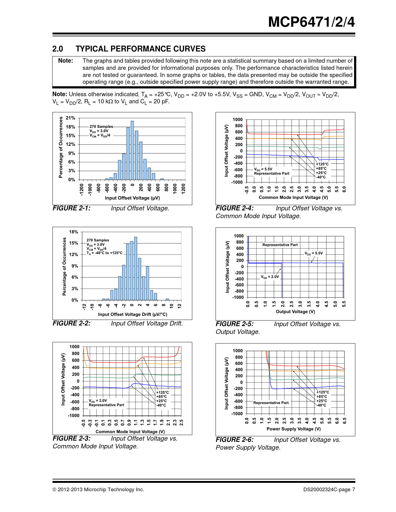 Input Offset Voltage vs. Common Mode Input Voltage. Power Supply Voltage.  2012-2013 Microchip Technology Inc. DS20002324C-page 7 Document Outline Package Types Typical Application 1.0 Electrical Characteristics 1.1 Absolute Maximum Ratings 1.2 Specifications TABLE 1-1: DC Electrical Specifications TABLE 1-2: AC Electrical Specifications TABLE 1-3: Temperature Specifications 1.3 Test Circuits FIGURE 1-1: AC and DC Test Circuit for Most Specifications. 2.0 Typical Performance Curves FIGURE 2-1: Input Offset Voltage. FIGURE 2-2: Input Offset Voltage Drift. FIGURE 2-3: Input Offset Voltage vs. Common Mode Input Voltage. FIGURE 2-4: Input Offset Voltage vs. Common Mode Input Voltage. FIGURE 2-5: Input Offset Voltage vs. Output Voltage. FIGURE 2-6: Input Offset Voltage vs. Power Supply Voltage. FIGURE 2-7: Input Noise Voltage Density vs. Frequency. FIGURE 2-8: Input Noise Voltage Density vs. Common Mode Input Voltage. FIGURE 2-9: CMRR, PSRR vs. Frequency. FIGURE 2-10: CMRR, PSRR vs. Ambient Temperature. FIGURE 2-11: Input Bias, Offset Currents vs. Ambient Temperature. FIGURE 2-12: Input Bias Current vs. Common Mode Input Voltage. FIGURE 2-13: Quiescent Current vs. Ambient Temperature. FIGURE 2-14: Quiescent Current vs. Common Mode Input Voltage. FIGURE 2-15: Quiescent Current vs. Common Mode Input Voltage. FIGURE 2-16: Quiescent Current vs. Power Supply Voltage. FIGURE 2-17: Open-Loop Gain, Phase vs. Frequency. FIGURE 2-18: DC Open-Loop Gain vs. Ambient Temperature. FIGURE 2-19: Gain Bandwidth Product, Phase Margin vs. Ambient Temperature. FIGURE 2-20: Gain Bandwidth Product, Phase Margin vs. Ambient Temperature. FIGURE 2-21: Output Short Circuit Current vs. Power Supply Voltage. FIGURE 2-22: Output Voltage Swing vs. Frequency. FIGURE 2-23: Output Voltage Headroom vs. Output Current. FIGURE 2-24: Output Voltage Headroom vs. Output Current. FIGURE 2-25: Output Voltage Headroom vs. Ambient Temperature. FIGURE 2-26: Output Voltage Headroom vs. Ambient Temperature. FIGURE 2-27: Slew Rate vs. Ambient Temperature. FIGURE 2-28: Small Signal Non-Inverting Pulse Response. FIGURE 2-29: Small Signal Inverting Pulse Response. FIGURE 2-30: Large Signal Non-Inverting Pulse Response. FIGURE 2-31: Large Signal Inverting Pulse Response. FIGURE 2-32: The MCP6471/2/4 Shows No Phase Reversal. FIGURE 2-33: Closed Loop Output Impedance vs. Frequency. FIGURE 2-34: Measured Input Current vs. Input Voltage (below VSS). FIGURE 2-35: Channel-to-Channel Separation vs. Frequency (MCP6472/4 only). 3.0 Pin Descriptions TABLE 3-1: Pin Function Table 3.1 Analog Outputs 3.2 Analog Inputs 3.3 Power Supply Pins 3.4 Exposed Thermal Pad (EP) 4.0 Application Information 4.1 Inputs FIGURE 4-1: Simplified Analog Input ESD Structures. FIGURE 4-2: Protecting the Analog Inputs. FIGURE 4-3: Protecting the Analog Inputs. 4.2 Rail-to-Rail Output 4.3 Capacitive Loads FIGURE 4-4: Output Resistor, RISO Stabilizes Large Capacitive Loads. FIGURE 4-5: Recommended RISO Values for Capacitive Loads. 4.4 Supply Bypass 4.5 Unused Op Amps FIGURE 4-6: Unused Op Amps. 4.6 PCB Surface Leakage FIGURE 4-7: Example Guard Ring Layout for Inverting Gain. 4.7 Application Circuits FIGURE 4-8: Photovoltaic Mode Detector. FIGURE 4-9: Photoconductive Mode Detector. FIGURE 4-10: Second-Order, Low-Pass Butterworth Filter with Sallen-Key Topology. FIGURE 4-11: Second-Order, Low-Pass Butterworth Filter with Multiple-Feedback Topology. FIGURE 4-12: pH Electrode Amplifier. 5.0 Design Aids 5.1 SPICE Macro Model 5.2 FilterLab Software 5.3 MAPS (Microchip Advanced Part Selector) 5.4 Analog Demonstration and Evaluation Boards 5.5 Application Notes 6.0 Packaging Information 6.1 Package Marking Information Appendix A: Revision History Product Identification System Trademarks Worldwide Sales and Service