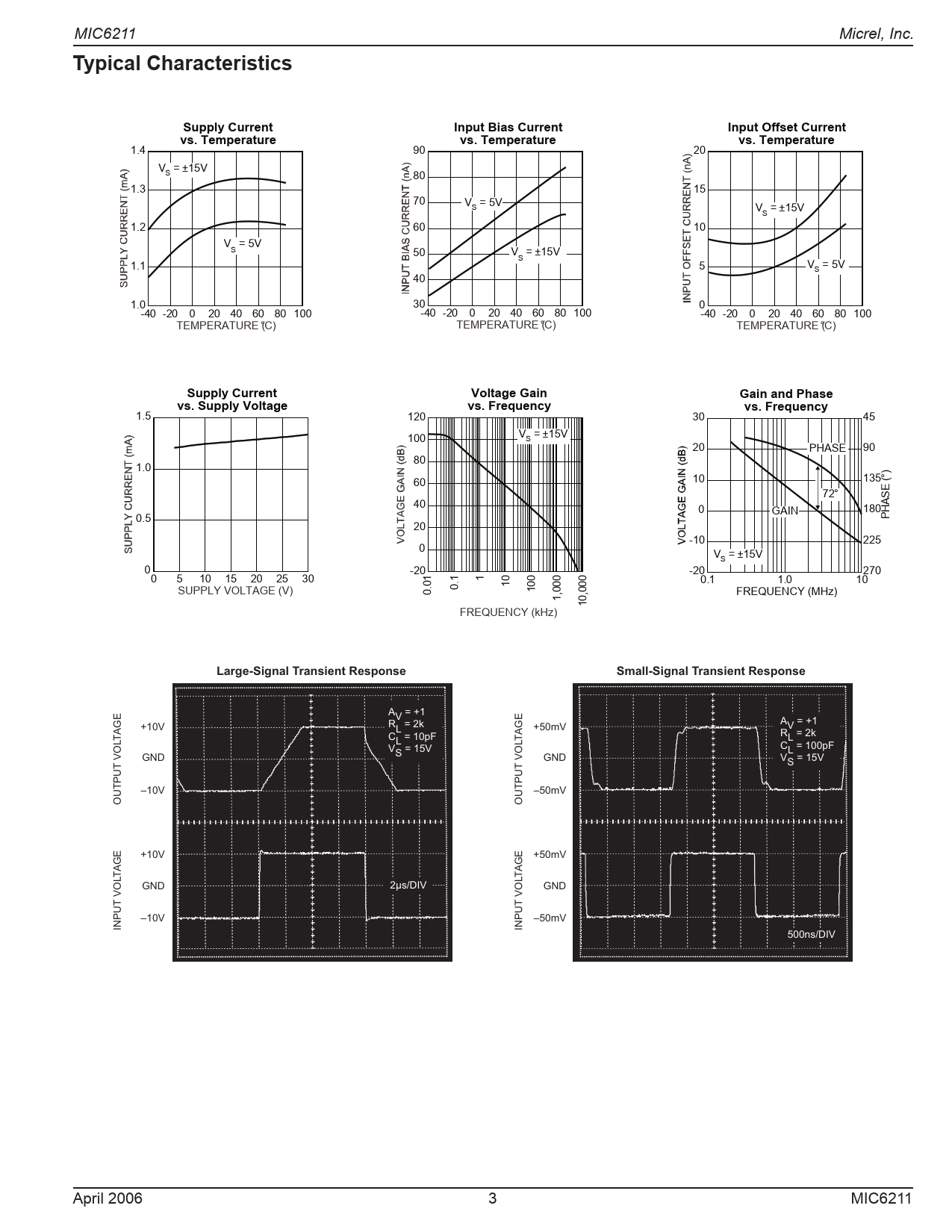 MIC6211 Micrel, Inc. Typical CharacteristicsSupply CurrentInput Bias CurrentInput Offset Currentvs. Temperaturevs. Temperaturevs. Temperature 1.4 90 20 VS = ±15V 80 1.3 15 70 VS = 5V VS = ±15V 1.2 60 10 V = 5V S 50 V = ±15V S 1.1 5 VS = 5V 40 1.0 30 0 -40 -20 0 20 40 60 80 100 -40 -20 0 20 40 60 80 100 -40 -20 0 20 40 60 80 100 TEMPERATURE (°C) TEMPERATURE (°C) TEMPERATURE (°C) Supply CurrentVoltage GainGain and Phasevs. Supply Voltagevs. Frequencyvs. Frequency 1.5 120 30 45 100 VS = ±15V 20 PHASE 90 1.0 80 °) 60 10 135 (E 72° S 40 A 0 GAIN 180 H 0.5 P 20 -10 225 0 VS = ±15V 0 -20 -20 270 0 5 10 15 20 25 30 10 1. 1 01 00 00 00 0.1 1.0 10 SUPPLY VOLTAGE (V) .0 0 1 ,0 0 1 ,0 FREQUENCY (MHz) 1 FREQUENCY (kHz) Large-Signal Transient ResponseSmall-Signal Transient Response AV = +1 A +10V R V = +1 AGE L = 2k +50mV AGE T C T R L L = 10pF L L = 2k V C S = 15V L = 100pF VO GND VO GND VS = 15V –10V –50mV +10V +50mV AGE OUTPUT AGE OUTPUT T T GND 2µs/DIV GND VOL VOL –10V –50mV INPUT INPUT 500ns/DIV April 2006 3 MIC6211