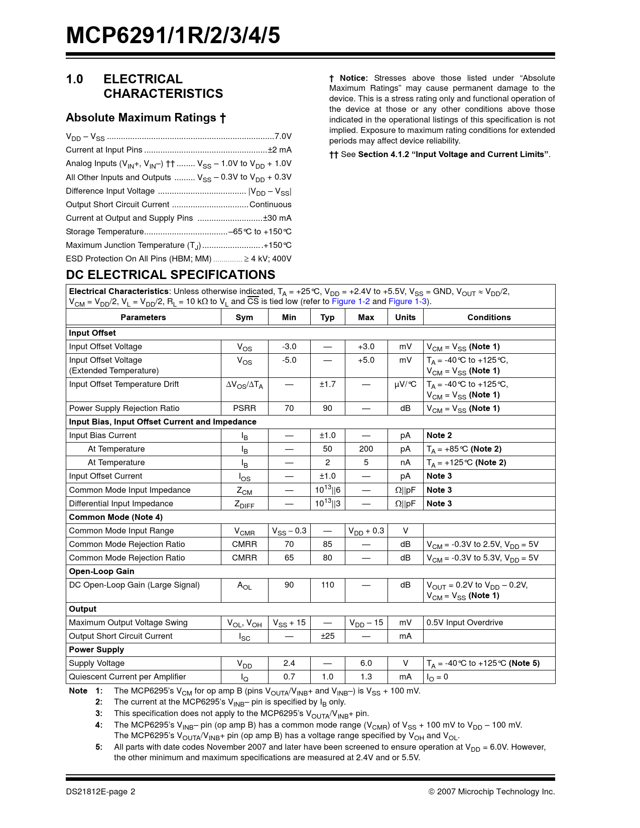 MCP6291/1R/2/3/4/5 1.0 ELECTRICAL † Notice: