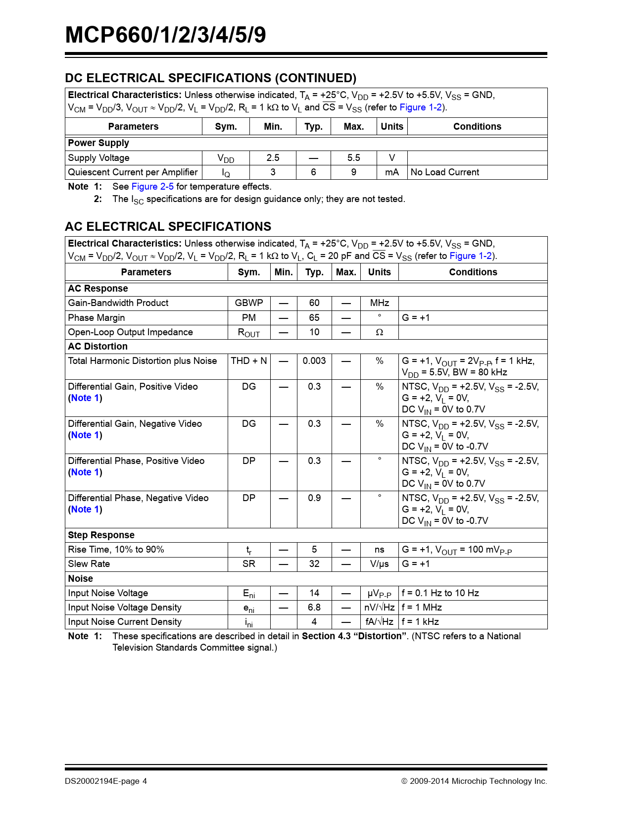 link to page 6 link to page 4 link to page 4 link to page 4 link to page 4 link to page 23 MCP660/1/2/3/4/5/9DC ELECTRICAL SPECIFICATIONS (CONTINUED)Electrical Characteristics: Unless otherwise indicated, TA = +25°C, VDD = +2.5V to +5.5V, VSS = GND, VCM = VDD/3, VOUT VDD/2, VL = VDD/2, RL = 1 k to VL and CS = VSS (refer to Figure 1-2). ParametersSym.Min.Typ.Max.UnitsConditionsPower Supply Supply Voltage VDD 2.5 — 5.5 V Quiescent Current per Amplifier IQ 3 6 9 mA No Load Current Note 1: See Figure 2-5 for temperature effects. 2: The ISC specifications are for design guidance only; they are not tested. AC ELECTRICAL SPECIFICATIONSElectrical Characteristics: Unless otherwise indicated, TA = +25°C, VDD = +2.5V to +5.5V, VSS = GND, VCM = VDD/2, VOUT VDD/2, VL = VDD/2, RL = 1 k to VL, CL = 20 pF and CS = VSS (refer to Figure 1-2). ParametersSym.Min.Typ.Max.UnitsConditionsAC Response Gain-Bandwidth Product GBWP — 60 — MHz Phase Margin PM — 65 — ° G = +1 Open-Loop Output Impedance ROUT — 10 — AC Distortion Total Harmonic Distortion plus Noise THD + N — 0.003 — % G = +1, VOUT = 2VP-P, f = 1 kHz, VDD = 5.5V, BW = 80 kHz Differential Gain, Positive Video DG — 0.3 — % NTSC, VDD = +2.5V, VSS = -2.5V, (Note 1) G = +2, VL = 0V, DC VIN = 0V to 0.7V Differential Gain, Negative Video DG — 0.3 — % NTSC, VDD = +2.5V, VSS = -2.5V, (Note 1) G = +2, VL = 0V, DC VIN = 0V to -0.7V Differential Phase, Positive Video DP — 0.3 — ° NTSC, VDD = +2.5V, VSS = -2.5V, (Note 1) G = +2, VL = 0V, DC VIN = 0V to 0.7V Differential Phase, Negative Video DP — 0.9 — ° NTSC, VDD = +2.5V, VSS = -2.5V, (Note 1) G = +2, VL = 0V, DC VIN = 0V to -0.7V Step Response Rise Time, 10% to 90% tr — 5 — ns G = +1, VOUT = 100 mVP-P Slew Rate SR — 32 — V/µs G = +1 Noise Input Noise Voltage Eni — 14 — µVP-P f = 0.1 Hz to 10 Hz Input Noise Voltage Density eni — 6.8 — nV/Hz f = 1 MHz Input Noise Current Density ini 4 — fA/Hz f = 1 kHz Note 1: These specifications are described in detail in Section 4.3 “Distortion” . (NTSC refers to a National Television Standards Committee signal.) DS20002194E-page 4 2009-2014 Microchip Technology Inc. Document Outline 60 MHz, 32 V/µs Rail-to-Rail Output (RRO) Op Amps Features: Typical Applications: Design Aids: Description: Typical Application Circuit High Gain-Bandwidth Op Amp Portfolio Package Types 1.0 Electrical Characteristics 1.1 Absolute Maximum Ratings † 1.2 Specifications DC Electrical Specifications AC Electrical Specifications Digital Electrical Specifications Temperature Specifications 1.3 Timing Diagram FIGURE 1-1: Timing Diagram. 1.4 Test Circuits FIGURE 1-2: AC and DC Test Circuit for Most Specifications. 2.0 Typical Performance Curves 2.1 DC Signal Inputs FIGURE 2-1: Input Offset Voltage. FIGURE 2-2: Input Offset Voltage Drift. FIGURE 2-3: Input Offset Voltage vs. Power Supply Voltage with VCM = 0V. FIGURE 2-4: Input Offset Voltage vs. Output Voltage. FIGURE 2-5: Low-Input Common-Mode Voltage Headroom vs. Ambient Temperature. FIGURE 2-6: High-Input Common-Mode Voltage Headroom vs. Ambient Temperature. FIGURE 2-7: Input Offset Voltage vs. Common-Mode Voltage with VDD = 2.5V. FIGURE 2-8: Input Offset Voltage vs. Common-Mode Voltage with VDD = 5.5V. FIGURE 2-9: CMRR and PSRR vs. Ambient Temperature. FIGURE 2-10: DC Open-Loop Gain vs. Ambient Temperature. FIGURE 2-11: DC Open-Loop Gain vs. Load Resistance. FIGURE 2-12: Input Bias and Offset Currents vs. Ambient Temperature with VDD = 5.5V. FIGURE 2-13: Input Bias Current vs. Input Voltage (below VSS). FIGURE 2-14: Input Bias and Offset Currents vs. Common-Mode Input Voltage with TA = +85°C. FIGURE 2-15: Input Bias and Offset Currents vs. Common-Mode Input Voltage with TA = +125°C. 2.2 Other DC Voltages and Currents FIGURE 2-16: Output Voltage Headroom vs. Output Current. FIGURE 2-17: Output Voltage Headroom vs. Ambient Temperature. FIGURE 2-18: Output Short Circuit Current vs. Power Supply Voltage. FIGURE 2-19: Supply Current vs. Power Supply Voltage. FIGURE 2-20: Supply Current vs. Common-Mode Input Voltage. 2.3 Frequency Response FIGURE 2-21: CMRR and PSRR vs. Frequency. FIGURE 2-22: Open-Loop Gain vs. Frequency. FIGURE 2-23: Gain-Bandwidth Product and Phase Margin vs. Ambient Temperature. FIGURE 2-24: Gain-Bandwidth Product and Phase Margin vs. Common-Mode Input Voltage. FIGURE 2-25: Gain-Bandwidth Product and Phase Margin vs. Output Voltage. FIGURE 2-26: Closed-Loop Output Impedance vs. Frequency. FIGURE 2-27: Gain Peaking vs. Normalized Capacitive Load. FIGURE 2-28: Channel-to-Channel Separation vs. Frequency. 2.4 Noise and Distortion FIGURE 2-29: Input Noise Voltage Density vs. Frequency. FIGURE 2-30: Input Noise Voltage Density vs. Input Common-Mode Voltage with f = 100 Hz. FIGURE 2-31: Input Noise Voltage Density vs. Input Common-Mode Voltage with f = 1 MHz. FIGURE 2-32: Input Noise vs. Time with 0.1 Hz Filter. FIGURE 2-33: THD+N vs. Frequency. FIGURE 2-34: Change in Gain Magnitude and Phase vs. DC Input Voltage. 2.5 Time Response FIGURE 2-35: Non-Inverting Small Signal Step Response. FIGURE 2-36: Non-Inverting Large Signal Step Response. FIGURE 2-37: Inverting Small Signal Step Response. FIGURE 2-38: Inverting Large Signal Step Response. FIGURE 2-39: The MCP660/1/2/3/4/5/9 Family Shows No Input Phase Reversal with Overdrive. FIGURE 2-40: Slew Rate vs. Ambient Temperature. FIGURE 2-41: Maximum Output Voltage Swing vs. Frequency. 2.6 Chip Select Response FIGURE 2-42: CS Current vs. Power Supply Voltage. FIGURE 2-43: CS and Output Voltages vs. Time with VDD = 2.5V. FIGURE 2-44: CS and Output Voltages vs. Time with VDD = 5.5V. FIGURE 2-45: CS Hysteresis vs. Ambient Temperature. FIGURE 2-46: CS Turn-On Time vs. Ambient Temperature. FIGURE 2-47: CS’s Pull-Down Resistor (RPD) vs. Ambient Temperature. FIGURE 2-48: Quiescent Current in Shutdown vs. Power Supply Voltage. FIGURE 2-49: Output Leakage Current vs. Output Voltage. 3.0 Pin Descriptions TABLE 3-1: Pin Function Table 3.1 Ana