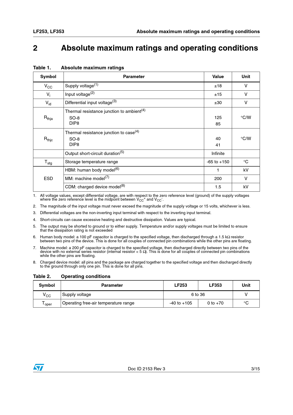 页数 / 页15 / 3 — LF253, LF353. Absolute maximum ratings and operating conditions. Table 1. …