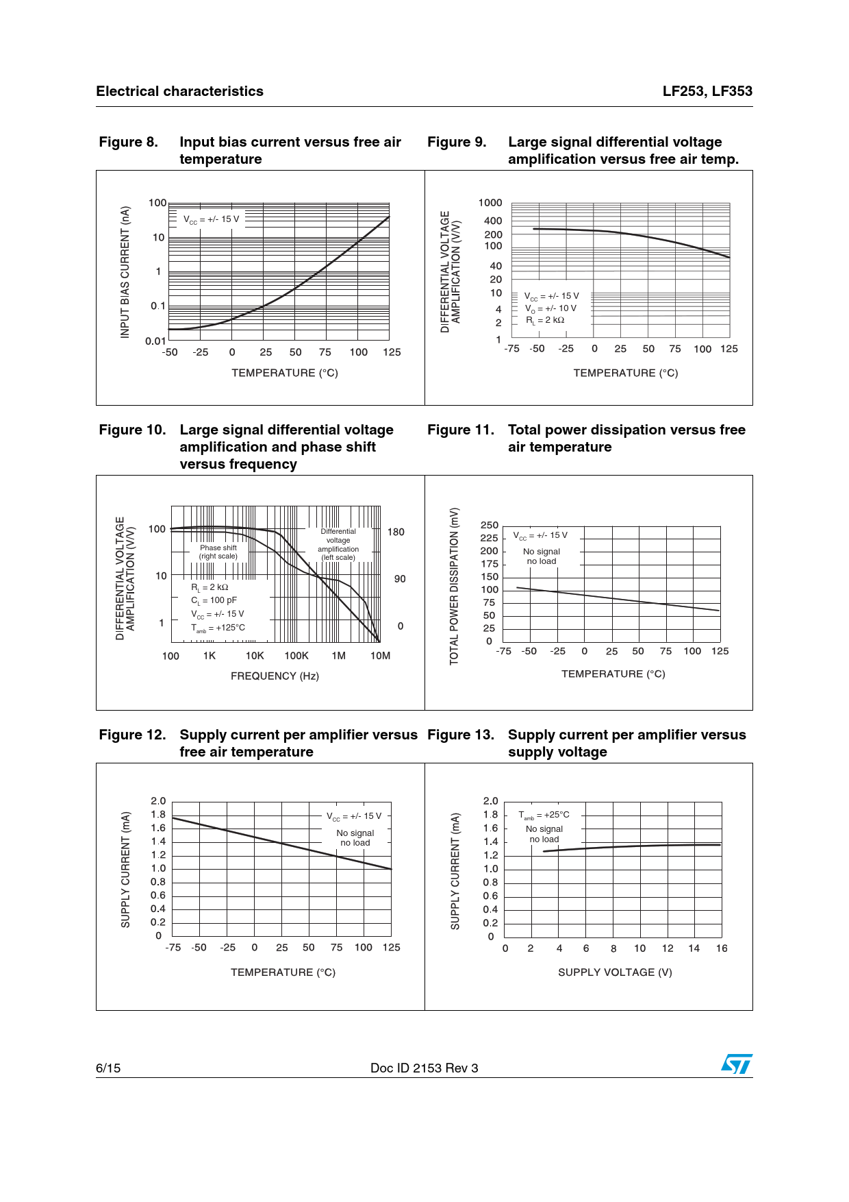 Electrical characteristicsLF253, LF353Figure 8.Input bias current versus free airFigure 9.Large signal differential voltagetemperatureamplification versus free air temp. V = +/- 15 V CC V = +/- 15 V CC V = +/- 10 V O R = 2 kΩ L Figure 10.Large signal differential voltageFigure 11.Total power dissipation versus freeamplification and phase shiftair temperatureversus frequency Differential V = +/- 15 V voltage CC Phase shift amplification No signal (right scale) (left scale) no load R = 2 kΩ L C = 100 pF L V = +/- 15 V CC T = +125°C amb Figure 12.Supply current per amplifier versus Figure 13.Supply current per amplifier versusfree air temperaturesupply voltage V = +/- 15 V T = +25°C CC amb No signal No signal no load no load 6/15 Doc ID 2153 Rev 3 Document Outline 1 Schematics Figure 1. Schematic diagram (each amplifier) 2 Absolute maximum ratings and operating conditions Table 1. Absolute maximum ratings Table 2. Operating conditions 3 Electrical characteristics Table 3. Electrical characteristics at VCC = ±15 V, Tamb = +25˚C (unless otherwise specified) Figure 2. Maximum peak-to-peak output voltage vs. frequency, RL = 2 kW Figure 3. Maximum peak-to-peak output voltage vs. frequency, RL = 10 kW Figure 4. Maximum peak-to-peak output voltage versus frequency Figure 5. Maximum peak-to-peak output voltage versus free air temperature Figure 6. Maximum peak-to-peak output voltage versus load resistance Figure 7. Maximum peak-to-peak output voltage versus supply voltage Figure 8. Input bias current versus free air temperature Figure 9. Large signal differential voltage amplification versus free air temp. Figure 10. Large signal differential voltage amplification and phase shift versus frequency Figure 11. Total power dissipation versus free air temperature Figure 12. Supply current per amplifier versus free air temperature Figure 13. Supply current per amplifier versus supply voltage Figure 14. Common mode rejection ratio versus free air temperature Figure 15. Voltage follower large signal pulse response Figure 16. Output voltage versus elapsed time Figure 17. Equivalent input noise voltage versus frequency Figure 18. Total harmonic distortion versus frequency 4 Parameter measurement information Figure 19. Voltage follower Figure 20. Gain of 10 inverting amplifier 5 Typical application Figure 21. Quadruple oscillator 6 Package information 6.1 DIP8 package information Figure 22. DIP8 package mechanical drawing Table 4. DIP8 package mechanical data 6.2 SO-8 package information Figure 23. SO-8 package mechanical drawing Table 5. SO-8 package mechanical data 7 Ordering information Table 6. Order codes 8 Revision history Table 7. Document revision history
