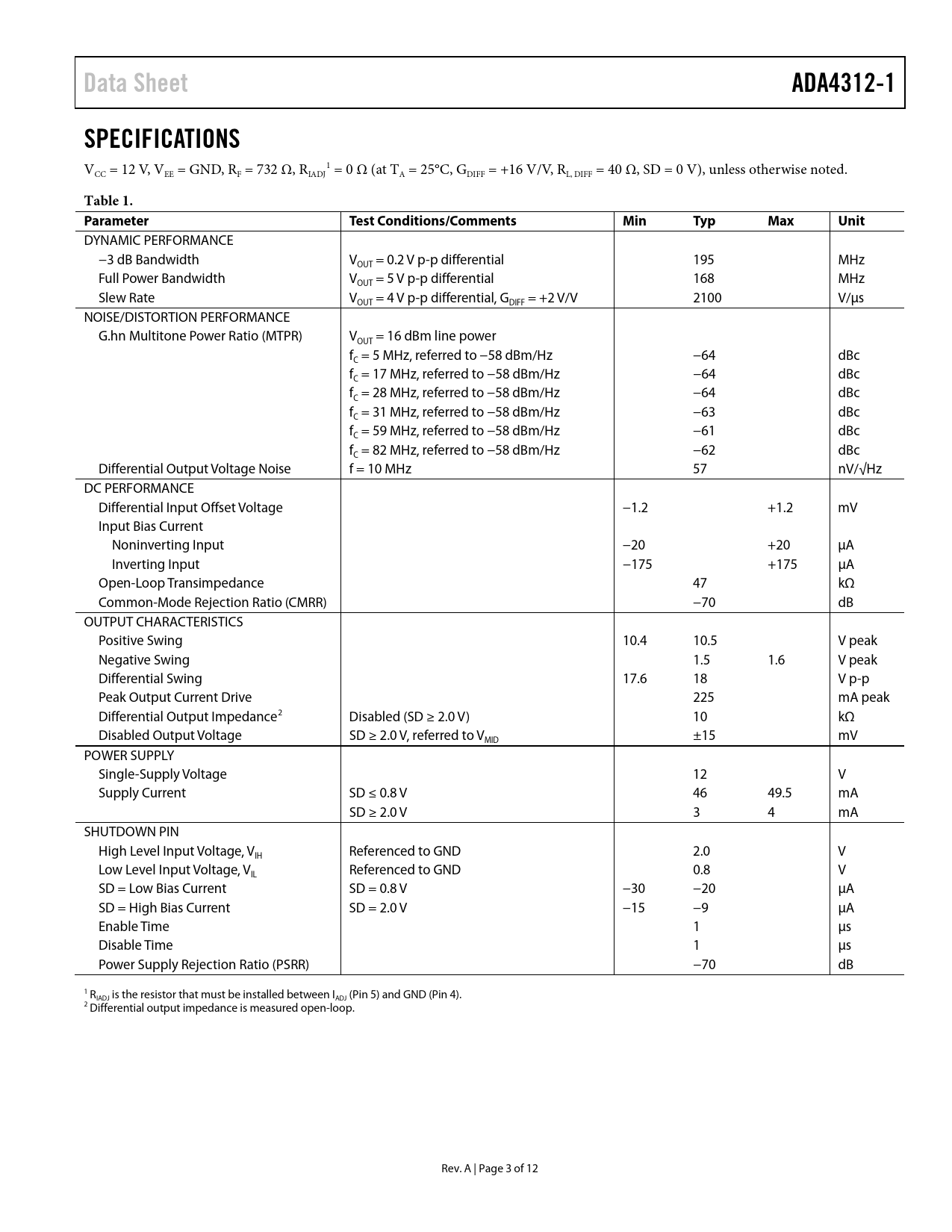 Data Sheet. ADA4312-1. SPECIFICATIONS. Table 1. Parameter. Test Conditions/Comments. Min. Typ. Max. Unit