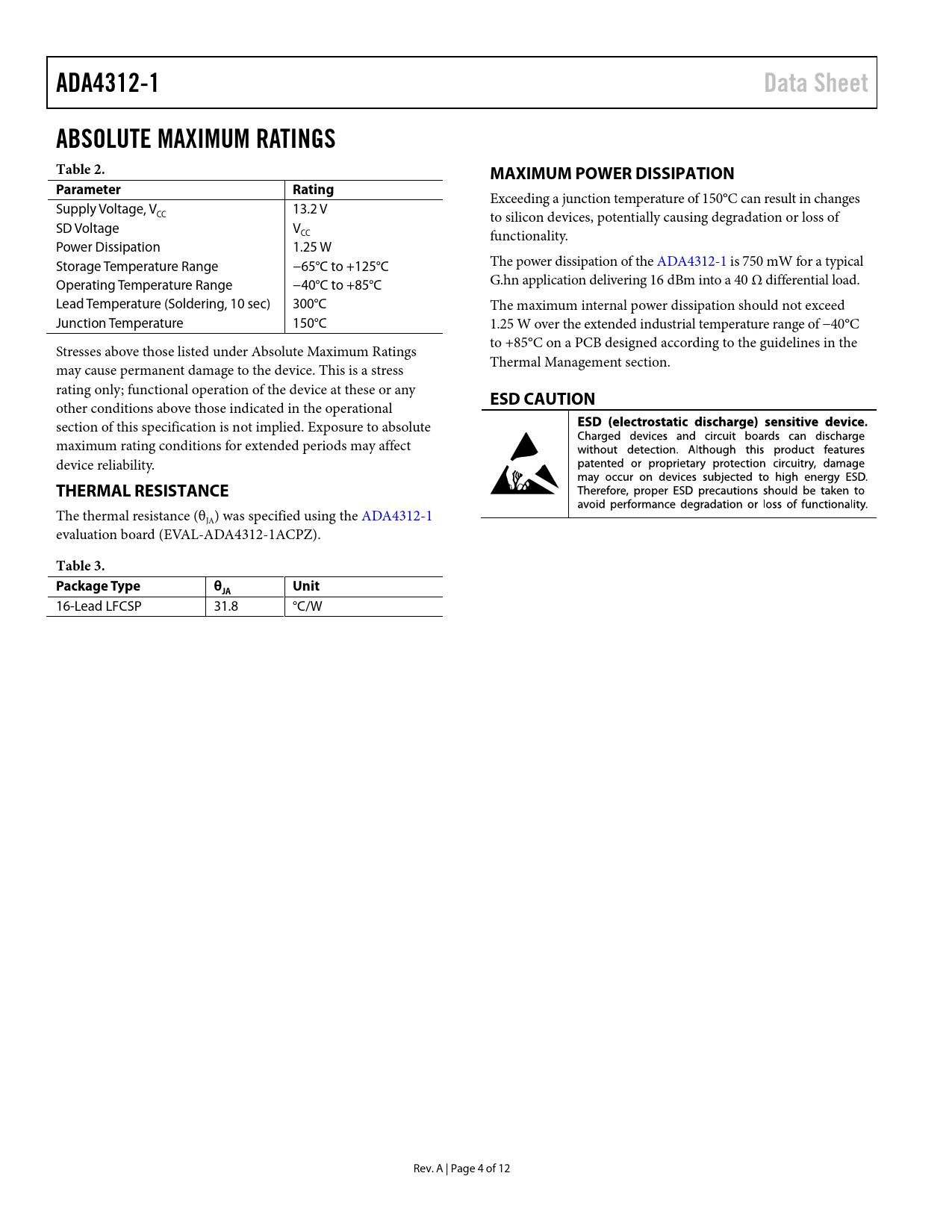 link to page 11 ADA4312-1Data SheetABSOLUTE MAXIMUM RATINGS Table 2.MAXIMUM POWER DISSIPATIONParameterRating Exceeding a junction temperature of 150°C can result in changes Supply Voltage, V 13.2 V CC to silicon devices, potentially causing degradation or loss of SD Voltage V CC functionality. Power Dissipation 1.25 W Storage Temperature Range −65°C to +125°C The power dissipation of the ADA4312-1 is 750 mW for a typical Operating Temperature Range −40°C to +85°C G.hn application delivering 16 dBm into a 40 Ω differential load. Lead Temperature (Soldering, 10 sec) 300°C The maximum internal power dissipation should not exceed Junction Temperature 150°C 1.25 W over the extended industrial temperature range of −40°C Stresses above those listed under Absolute Maximum Ratings to +85°C on a PCB designed according to the guidelines in the may cause permanent damage to the device. This is a stress Thermal Management section. rating only; functional operation of the device at these or any ESD CAUTION other conditions above those indicated in the operational section of this specification is not implied. Exposure to absolute maximum rating conditions for extended periods may affect device reliability. THERMAL RESISTANCE The thermal resistance (θJA) was specified using the ADA4312-1 evaluation board (EVAL-ADA4312-1ACPZ). Table 3.Package TypeθUnitJA 16-Lead LFCSP 31.8 °C/W Rev. A | Page 4 of 12 Document Outline Features Applications General Description Functional Block Diagram Typical Application Circuit Revision History Specifications Absolute Maximum Ratings Thermal Resistance Maximum Power Dissipation ESD Caution Pin Configuration and Function Descriptions Typical Performance Characteristics Test Circuit Applications Information Feedback Resistor Selection General Operation Half-Duplex Operation Establishing VMID Bias Control and Linearity PCB Layout Thermal Management Power Supply Bypassing Evaluation Board Outline Dimensions Ordering Guide