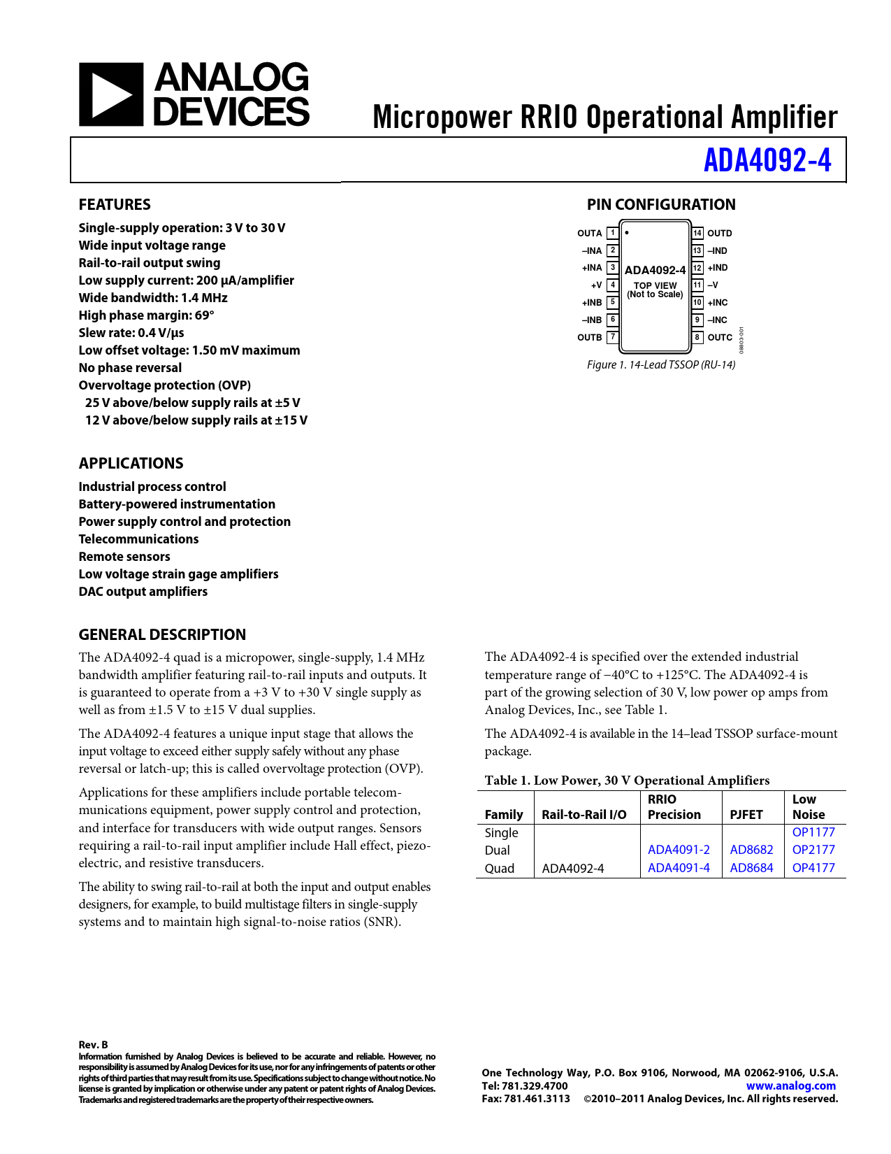 Micropower RRIO Operational Amplifier. ADA4092-4. FEATURES. PIN CONFIGURATION. Single-supply operation: 3 V to 30 V. OUTA. 14 OUTD