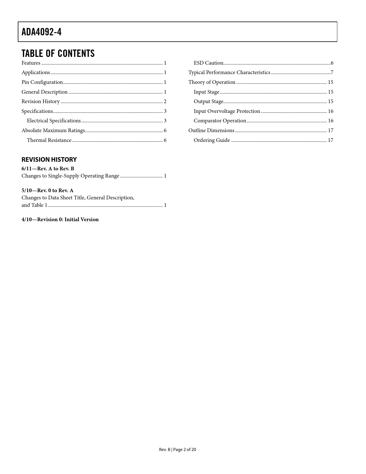 ADA4092-4. TABLE OF CONTENTS. REVISION HISTORY 6/11—Rev. A to Rev. B. 5/10—Rev. 0 to Rev. A. 4/10—Revision 0: Initial Version