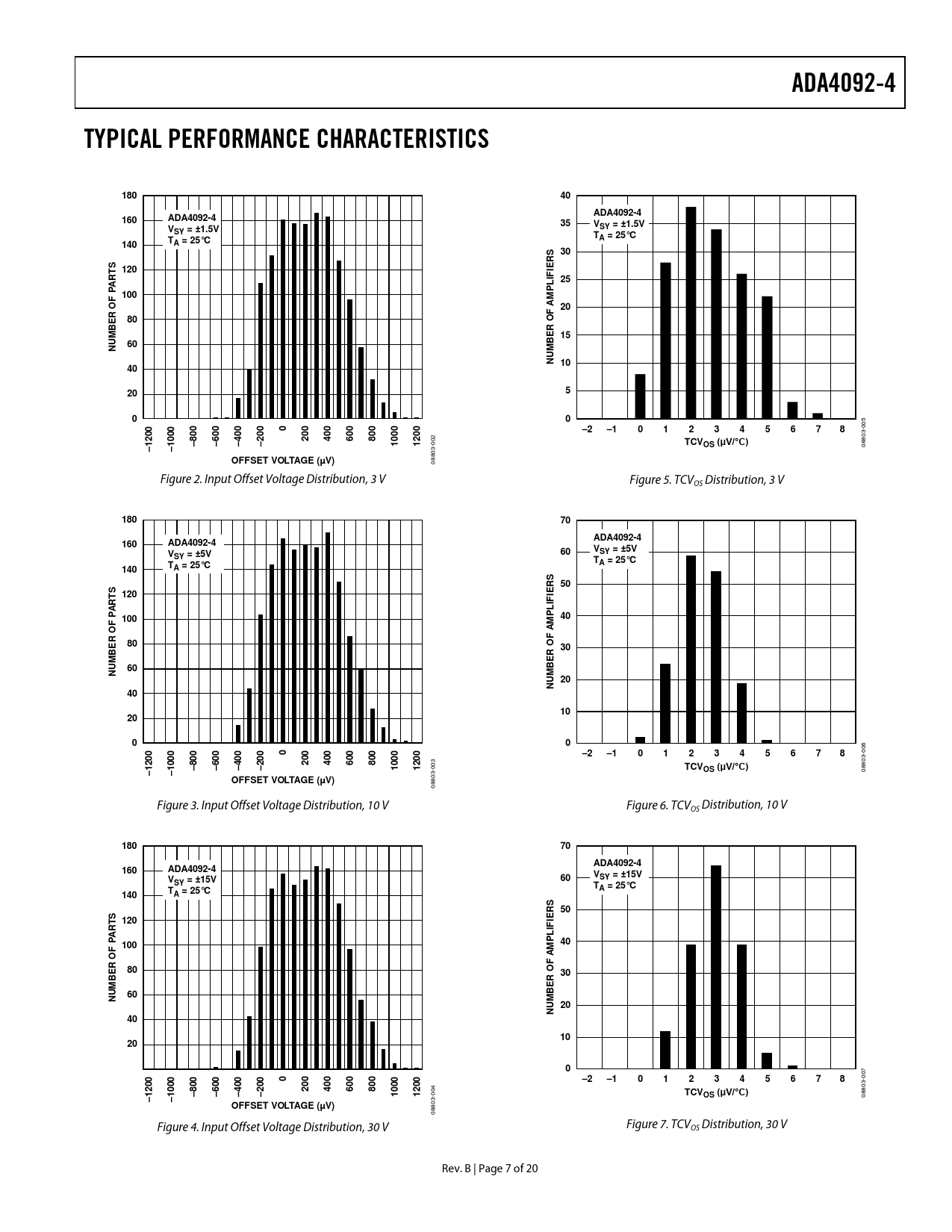 文件文字版本 ADA4092-4 TYPICAL PERFORMANCE CHARACTERISTICS 180 40 ADA4092-4 160 ADA4092-4 35 V V SY = ±1.5V SY = ±1.5V T T A = 25°C 140 A = 25°C S 30 R S 120 25 ART LIFIE P P 100 F M A 20 R O F 80 BE R O 15 60 BE NUM NUM 10 40 20 5 0 0 0 –2 –1 0 1 2 3 4 5 6 7 8 005200 400 600 800 –800 –600 –400 –200 1000 1200 002TCV –1200 –1000 OS (μV/°C) 08803-OFFSET VOLTAGE (µV) 08803- Figure 2. Input Offset Voltage Distribution, 3 V Figure 5. TCVOS Distribution, 3 V180 70 ADA4092-4 160 ADA4092-4 V V 60 SY = ±5V SY = ±5V T T A = 25°C 140 A = 25°C S R 50 S 120 ART LIFIE P P 100 40 F M A R O F 80 30 BE R O 60 BE NUM 20 NUM 40 10 20 0 0 0 –2 –1 0 1 2 3 4 5 6 7 8 006200 400 600 800 –800 –600 –400 –200 1000 1200 003TCV –1200 –1000 OS (μV/°C) 08803-OFFSET VOLTAGE (µV) 08803- Figure 3. Input Offset Voltage Distribution, 10 V Figure 6. TCVOS Distribution, 10 V180 70 ADA4092-4 160 ADA4092-4 V V 60 SY = ±15V SY = ±15V T T A = 25°C 140 A = 25°C S R 50 S 120 ART LIFIE P P 100 40 F M A F R O 80 30 BE R O 60 BE NUM 20 NUM 40 10 20 0 0 –2 –1 0 1 2 3 4 5 6 7 8 007200 400 600 800 –800 –600 –400 –200 1000 1200 004TCV –1200 –1000 OS (μV/°C) 08803-OFFSET VOLTAGE (µV) 08803- Figure 4. Input Offset Voltage Distribution, 30 V Figure 7. TCVOS Distribution, 30 V Rev. B | Page 7 of 20 Document Outline Features Applications Pin Configuration General Description Revision History Specifications Electrical Specifications Absolute Maximum Ratings Thermal Resistance ESD Caution Typical Performance Characteristics Theory of Operation Input Stage Output Stage Input Overvoltage Protection Comparator Operation Outline Dimensions Ordering Guide