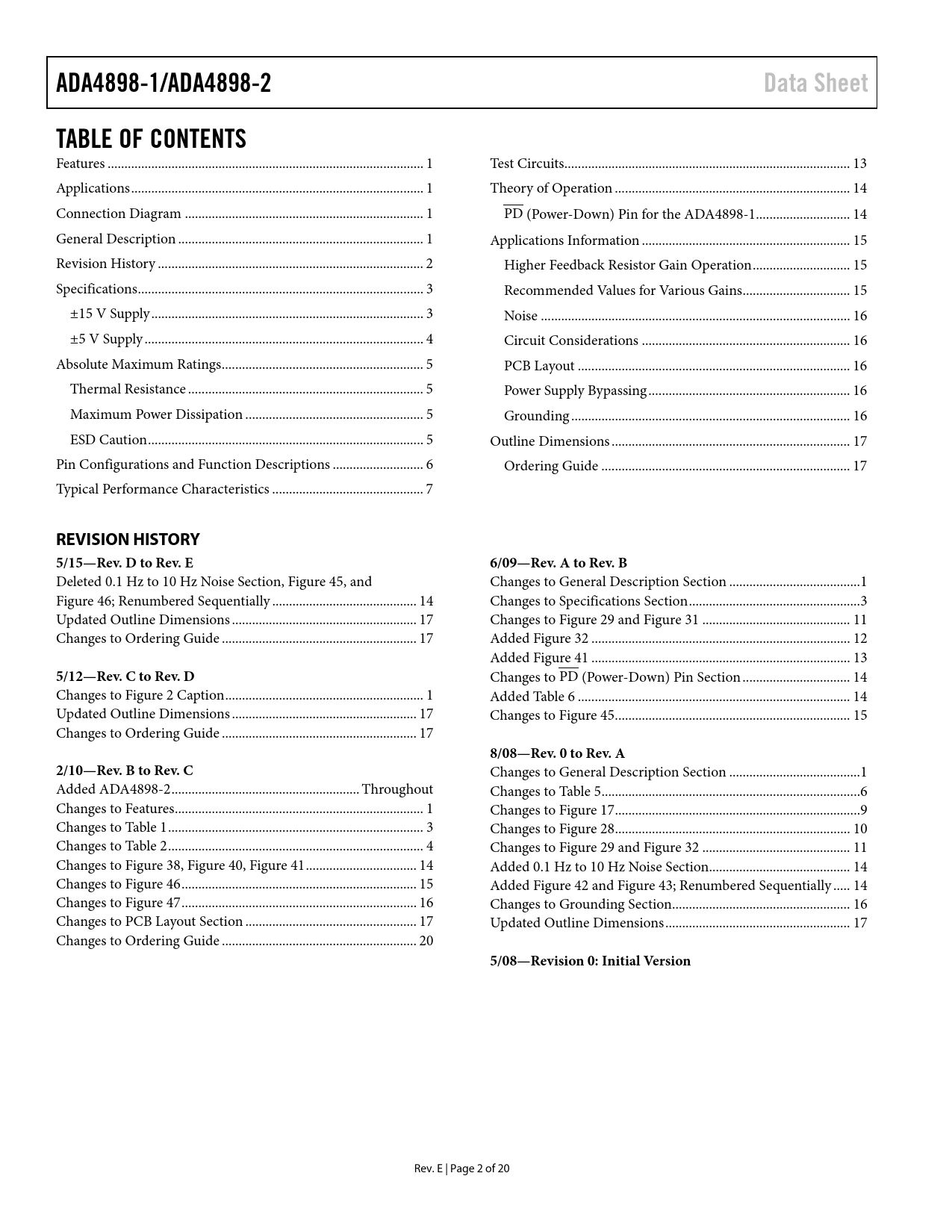 页数 / 页20 / 2 — ADA4898-1/ADA4898-2. Data Sheet. TABLE OF CONTENTS. REVISION HISTORY …