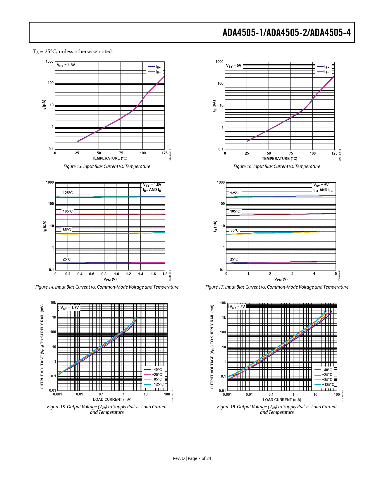 ADA4505-1/ADA4505-2/ADA4505-4. 1000. VSY = 1.8V. SY = 5V. IB+. IB–. 100. ) A. (pA. I B. 0.1. 125. TEMPERATURE (°C). VSY = 5V. IB+ AND IB–. 125°C