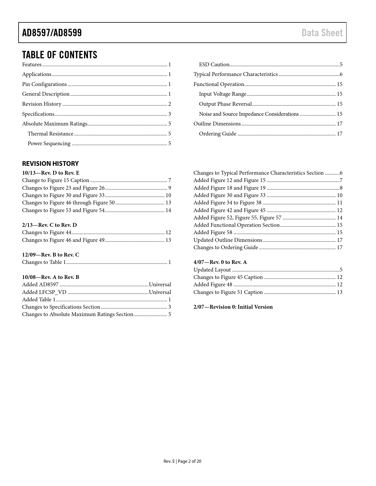 link to page 1 link to page 1 link to page 1 link to page 1 link to page 2 link to page 3 link to page 5 link to page 5 link to page 5 link to page 5 link to page 6 link to page 15 link to page 15 link to page 15 link to page 15 link to page 17 link to page 17 AD8597/AD8599Data SheetTABLE OF CONTENTS Features .. 1 ESD Caution...5 Applications ... 1 Typical Performance Characteristics ..6 Pin Configurations ... 1 Functional Operation... 15 General Description ... 1 Input Voltage Range ... 15 Revision History ... 2 Output Phase Reversal ... 15 Specifications ... 3 Noise and Source Impedance Considerations ... 15 Absolute Maximum Ratings .. 5 Outline Dimensions ... 17 Thermal Resistance .. 5 Ordering Guide .. 17 Power Sequencing .. 5 REVISION HISTORY 10/13—Rev. D to Rev. E Changes to Typical Performance Characteristics Section ... 6 Change to Figure 15 Caption .. 7 Added Figure 12 and Figure 15 ... 7 Changes to Figure 23 and Figure 26 ... 9 Added Figure 18 and Figure 19 ... 8 Changes to Figure 30 and Figure 33 ... 10 Added Figure 30 and Figure 33 .. 10 Changes to Figure 46 through Figure 50 ... 13 Added Figure 34 to Figure 38 ... 11 Changes to Figure 53 and Figure 54 ... 14 Added Figure 42 and Figure 45 .. 12 Added Figure 52, Figure 55, Figure 57 .. 14 2/13—Rev. C to Rev. D Added Functional Operation Section .. 15 Changes to Figure 44 .. 12 Added Figure 58 ... 15 Changes to Figure 46 and Figure 49 ... 13 Updated Outline Dimensions ... 17 Changes to Ordering Guide .. 17 12/09—Rev. B to Rev. C Changes to Table 1 .. 1 4/07—Rev. 0 to Rev. A Updated Layout ... 5 10/08—Rev. A to Rev. B Changes to Figure 45 Caption .. 12 Added AD8597 ... Universal Added Figure 48 ... 12 Added LFCSP_VD ... Universal Changes to Figure 51 Caption .. 13 Added Table 1 .. 1 Changes to Specifications Section .. 3 2/07—Revision 0: Initial Version Changes to Absolute Maximum Ratings Section ... 5 Rev. E | Page 2 of 20 Document Outline Features Applications Pin Configurations General Description Table of Contents Revision History Specifications Absolute Maximum Ratings Thermal Resistance Power Sequencing ESD Caution Typical Performance Characteristics Functional Operation Input Voltage Range Output Phase Reversal Noise and Source Impedance Considerations Outline Dimensions Ordering Guide
