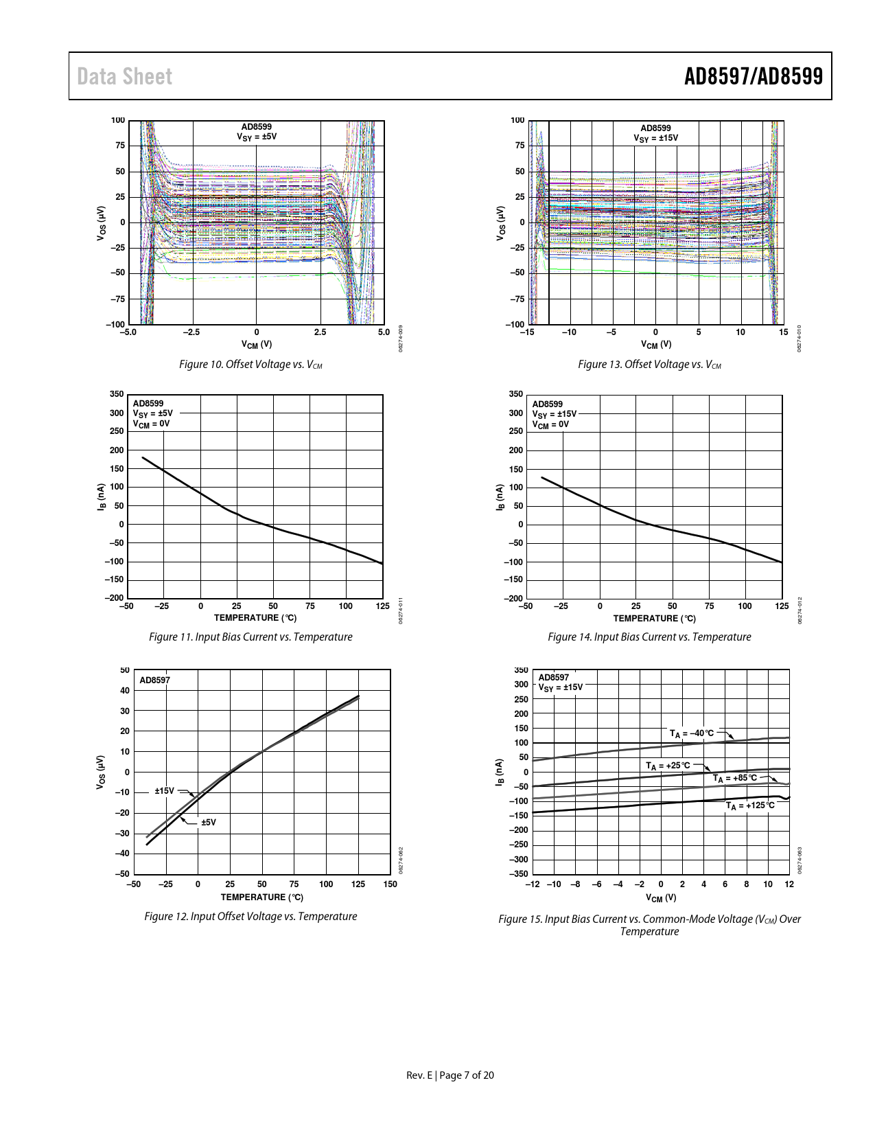 Data SheetAD8597/AD8599100100AD8599AD8599VSY = ±5VVSY = ±15V757550502525V)V)(µ0(µ0OSOSVV–25–25–50–50–75–75–100–100–5.0–2.502.55.0 009 –15–10–5051015 010 VCM (V)VCM (V) 06274- 06274- Figure 10. Offset Voltage vs. VCM Figure 13. Offset Voltage vs. VCM 350350AD8599AD8599300VSY = ±5V300VSY = ±15VVCM = 0VVCM = 0V250250200200150150100A)100A)nn((I B50I B5000–50–50–100–100–150–150–200–200–50–250255075100125 011 –50–250255075100125 012 TEMPERATURE (°C)TEMPERATURE (°C) 06274- 06274- Figure 11. Input Bias Current vs. Temperature Figure 14. Input Bias Current vs. Temperature 50350AD8597AD859730040VSY = ±15V2503020020150TA = –40°C10010V)50A)T(µA = +25°C0n0(TOSA = +85°CVI B–50–10±15V–100TA = +125°C–20–150±5V–30–200–250–40 062 063 –300–50 06274- –350 06274- –50–250255075100125150–12 –10–8–6–4–2024681012TEMPERATURE (°C)VCM (V) Figure 12. Input Offset Voltage vs. Temperature Figure 15. Input Bias Current vs. Common-Mode Voltage (VCM) Over Temperature Rev. E | Page 7 of 20 Document Outline Features Applications Pin Configurations General Description Table of Contents Revision History Specifications Absolute Maximum Ratings Thermal Resistance Power Sequencing ESD Caution Typical Performance Characteristics Functional Operation Input Voltage Range Output Phase Reversal Noise and Source Impedance Considerations Outline Dimensions Ordering Guide