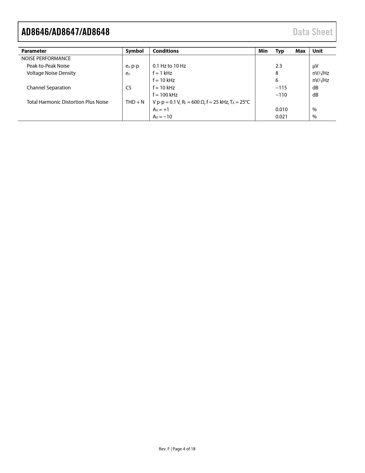 NOISE PERFORMANCE Peak-to-Peak Noise en p-p 0.1 Hz to 10 Hz 2.3 μV Voltage Noise Density en f = 1 kHz 8 nV/√Hz f = 10 kHz 6 nV/√Hz Channel Separation CS f = 10 kHz −115 dB f = 100 kHz −110 dB Total Harmonic Distortion Plus Noise THD + N V p-p = 0.1 V, RL = 600 Ω, f = 25 kHz, TA = 25°C AV = +1 0.010 % AV = −10 0.021 % Rev. F | Page 4 of 18 Document Outline FEATURES APPLICATIONS PIN CONFIGURATIONS GENERAL DESCRIPTION REVISION HISTORY Revision History: AD8646/AD8647/AD8648 Revision History: AD8646 Revision History: AD8648 SPECIFICATIONS ABSOLUTE MAXIMUM RATINGS THERMAL RESISTANCE ESD CAUTION TYPICAL PERFORMANCE CHARACTERISTICS THEORY OF OPERATION POWER-DOWN OPERATION MULTIPLEXING OPERATION OUTLINE DIMENSIONS ORDERING GUIDE