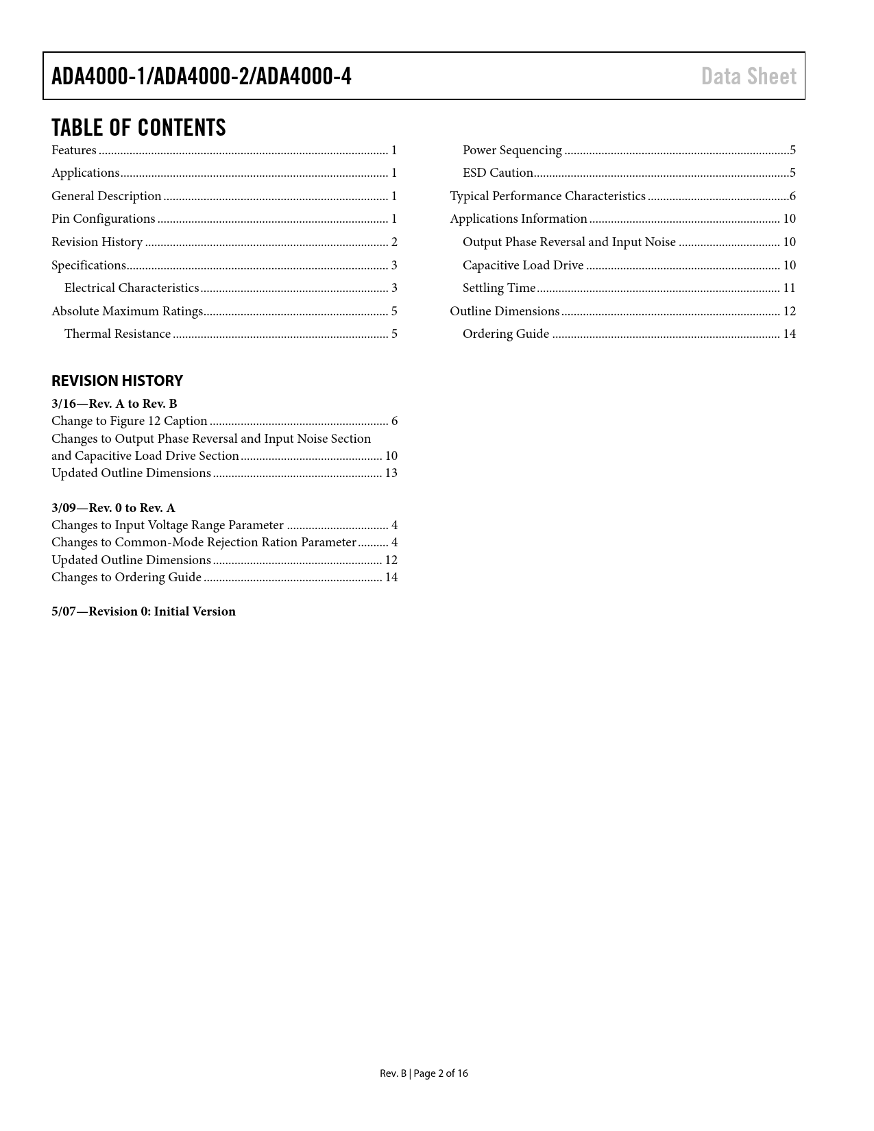 link to page 1 link to page 1 link to page 1 link to page 1 link to page 2 link to page 3 link to page 3 link to page 4 link to page 5 link to page 5 link to page 5 link to page 6 link to page 10 link to page 10 link to page 10 link to page 10 link to page 12 link to page 14 ADA4000-1/ADA4000-2/ADA4000-4Data SheetTABLE OF CONTENTS Features .. 1 Power Sequencing ...5 Applications ... 1 ESD Caution...5 General Description ... 1 Typical Performance Characteristics ..6 Pin Configurations ... 1 Applications Information .. 10 Revision History ... 2 Output Phase Reversal and Input Noise ... 10 Specifications ... 3 Capacitive Load Drive ... 10 Electrical Characteristics ... 3 Settling Time ... 11 Absolute Maximum Ratings .. 5 Outline Dimensions ... 12 Thermal Resistance .. 5 Ordering Guide .. 14 REVISION HISTORY3/16—Rev. A to Rev. B Change to Figure 12 Caption .. 6 Changes to Output Phase Reversal and Input Noise Section and Capacitive Load Drive Section .. 10 Updated Outline Dimensions ... 13 3/09—Rev. 0 to Rev. A Changes to Input Voltage Range Parameter ... 4 Changes to Common-Mode Rejection Ration Parameter .. 4 Updated Outline Dimensions ... 12 Changes to Ordering Guide .. 14 5/07—Revision 0: Initial Version Rev. B | Page 2 of 16 Document Outline FEATURES APPLICATIONS GENERAL DESCRIPTION PIN CONFIGURATIONS REVISION HISTORY SPECIFICATIONS ABSOLUTE MAXIMUM RATINGS THERMAL RESISTANCE POWER SEQUENCING ESD CAUTION TYPICAL PERFORMANCE CHARACTERISTICS APPLICATIONS INFORMATION OUTPUT PHASE REVERSAL AND INPUT NOISE CAPACITIVE LOAD DRIVE SETTLING TIME OUTLINE DIMENSIONS ORDERING GUIDE