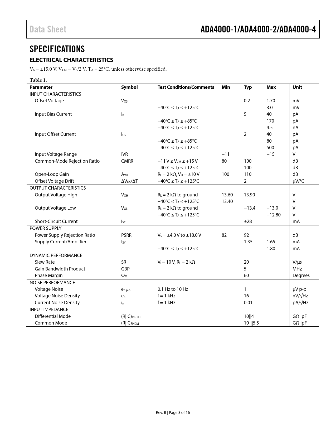 Data Sheet. ADA4000-1/ADA4000-2/ADA4000-4. SPECIFICATIONS ELECTRICAL CHARACTERISTICS. Table 1. Parameter. Symbol