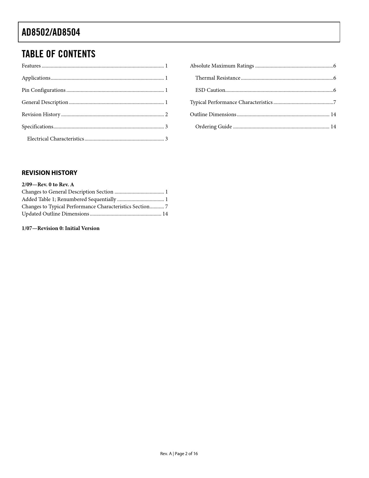页数 / 页16 / 2 — AD8502/AD8504. TABLE OF CONTENTS. REVISION HISTORY. 2/09—Rev. 0 to Rev. …