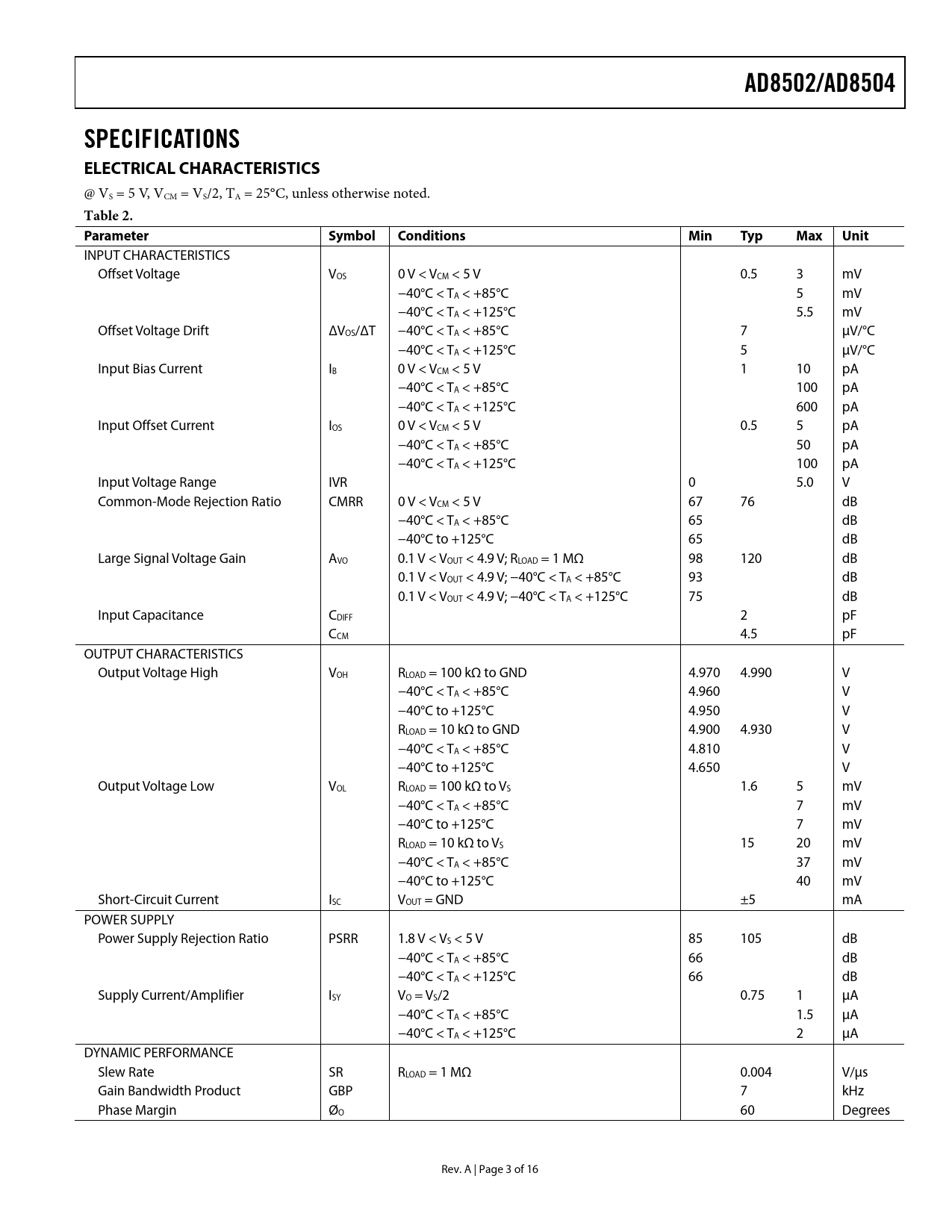 AD8502/AD8504. SPECIFICATIONS ELECTRICAL CHARACTERISTICS. Table 2. Parameter. Symbol. Conditions. Min. Typ. Max. Unit