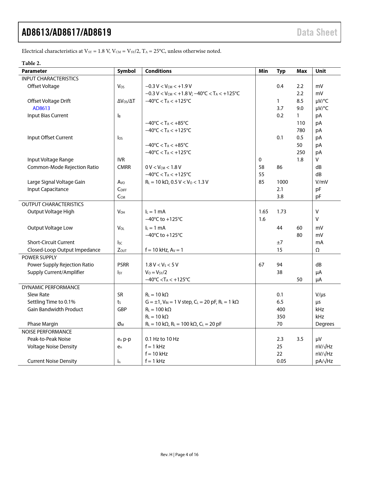AD8613/AD8617/AD8619Data Sheet Electrical characteristics at VSY = 1.8 V, VCM = VSY/2, TA = 25°C, unless otherwise noted. Table 2. ParameterSymbolConditionsMinTypMaxUnit INPUT CHARACTERISTICS Offset Voltage VOS −0.3 V < VCM < +1.9 V 0.4 2.2 mV −0.3 V < VCM < +1.8 V; −40°C < TA < +125°C 2.2 mV Offset Voltage Drift ∆VOS/∆T −40°C < TA < +125°C 1 8.5 μV/°C AD8613 3.7 9.0 μV/°C Input Bias Current IB 0.2 1 pA −40°C < TA < +85°C 110 pA −40°C < TA < +125°C 780 pA Input Offset Current IOS 0.1 0.5 pA −40°C < TA < +85°C 50 pA −40°C < TA < +125°C 250 pA Input Voltage Range IVR 0 1.8 V Common-Mode Rejection Ratio CMRR 0 V < VCM < 1.8 V 58 86 dB −40°C < TA < +125°C 55 dB Large Signal Voltage Gain AVO RL = 10 kΩ, 0.5 V < VO < 1.3 V 85 1000 V/mV Input Capacitance CDIFF 2.1 pF CCM 3.8 pF OUTPUT CHARACTERISTICS Output Voltage High VOH IL = 1 mA 1.65 1.73 V −40°C to +125°C 1.6 V Output Voltage Low VOL IL = 1 mA 44 60 mV −40°C to +125°C 80 mV Short-Circuit Current ISC ±7 mA Closed-Loop Output Impedance ZOUT f = 10 kHz, AV = 1 15 Ω POWER SUPPLY Power Supply Rejection Ratio PSRR 1.8 V < VS < 5 V 67 94 dB Supply Current/Amplifier ISY VO = VSY/2 38 μA −40°C <TA < +125°C 50 μA DYNAMIC PERFORMANCE Slew Rate SR RL = 10 kΩ 0.1 V/μs Settling Time to 0.1% tS G = ±1, VIN = 1 V step, CL = 20 pF, RL = 1 kΩ 6.5 μs Gain Bandwidth Product GBP RL = 100 kΩ 400 kHz RL = 10 kΩ 350 kHz Phase Margin ØM RL = 10 kΩ, RL = 100 kΩ, CL = 20 pF 70 Degrees NOISE PERFORMANCE Peak-to-Peak Noise en p-p 0.1 Hz to 10 Hz 2.3 3.5 μV Voltage Noise Density en f = 1 kHz 25 nV/√Hz f = 10 kHz 22 nV/√Hz Current Noise Density in f = 1 kHz 0.05 pA/√Hz Rev. H | Page 4 of 16 Document Outline FEATURES APPLICATIONS GENERAL DESCRIPTION PIN CONFIGURATIONS TABLE OF CONTENTS REVISION HISTORY SPECIFICATIONS ABSOLUTE MAXIMUM RATINGS THERMAL RESISTANCE ESD CAUTION TYPICAL PERFORMANCE CHARACTERISTICS OUTLINE DIMENSIONS ORDERING GUIDE AUTOMOTIVE PRODUCTS