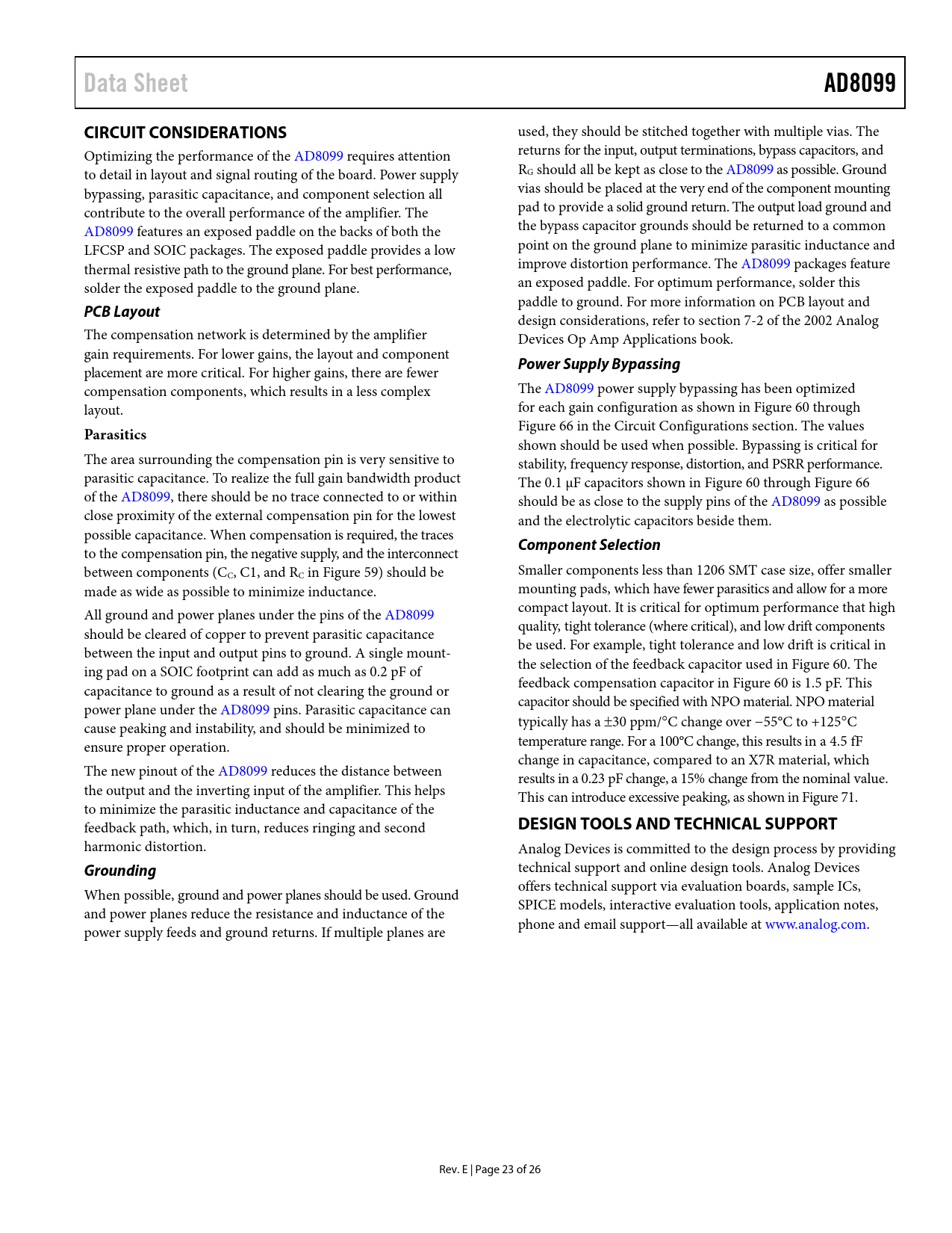link to page 18 link to page 19 link to page 20 link to page 19 link to page 19 link to page 20 link to page 19 link to page 19 link to page 22 Data SheetAD8099CIRCUIT CONSIDERATIONS used, they should be stitched together with multiple vias. The Optimizing the performance of the AD8099 requires attention returns for the input, output terminations, bypass capacitors, and to detail in layout and signal routing of the board. Power supply RG should all be kept as close to the AD8099 as possible. Ground bypassing, parasitic capacitance, and component selection all vias should be placed at the very end of the component mounting contribute to the overal performance of the amplifier. The pad to provide a solid ground return. The output load ground and AD8099 features an exposed paddle on the backs of both the the bypass capacitor grounds should be returned to a common LFCSP and SOIC packages. The exposed paddle provides a low point on the ground plane to minimize parasitic inductance and thermal resistive path to the ground plane. For best performance, improve distortion performance. The AD8099 packages feature solder the exposed paddle to the ground plane. an exposed paddle. For optimum performance, solder this paddle to ground. For more information on PCB layout and PCB Layout design considerations, refer to section 7-2 of the 2002 Analog The compensation network is determined by the amplifier Devices Op Amp Applications book. gain requirements. For lower gains, the layout and component placement are more critical. For higher gains, there are fewer Power Supply Bypassing compensation components, which results in a less complex The AD8099 power supply bypassing has been optimized layout. for each gain configuration as shown in Figure 60 through Parasitics Figure 66 in the Circuit Configurations section. The values shown should be used when possible. Bypassing is critical for The area surrounding the compensation pin is very sensitive to stability, frequency response, distortion, and PSRR performance. parasitic capacitance. To realize the ful gain bandwidth product The 0.1 µF capacitors shown in Figure 60 through Figure 66 of the AD8099, there should be no trace connected to or within should be as close to the supply pins of the AD8099 as possible close proximity of the external compensation pin for the lowest and the electrolytic capacitors beside them. possible capacitance. When compensation is required, the traces to the compensation pin, the negative supply, and the interconnect Component Selection between components (CC, C1, and RC in Figure 59) should be Smaller components less than 1206 SMT case size, offer smaller made as wide as possible to minimize inductance. mounting pads, which have fewer parasitics and al ow for a more All ground and power planes under the pins of the AD8099 compact layout. It is critical for optimum performance that high should be cleared of copper to prevent parasitic capacitance quality, tight tolerance (where critical), and low drift components between the input and output pins to ground. A single mount- be used. For example, tight tolerance and low drift is critical in ing pad on a SOIC footprint can add as much as 0.2 pF of the selection of the feedback capacitor used in Figure 60. The capacitance to ground as a result of not clearing the ground or feedback compensation capacitor in Figure 60 is 1.5 pF. This power plane under the AD8099 pins. Parasitic capacitance can capacitor should be specified with NPO material. NPO material cause peaking and instability, and should be minimized to typically has a ±30 ppm/°C change over −55°C to +125°C ensure proper operation. temperature range. For a 100°C change, this results in a 4.5 fF change in capacitance, compared to an X7R material, which The new pinout of the AD8099 reduces the distance between results in a 0.23 pF change, a 15% change from the nominal value. the output and the inverting input of the amplifier. This helps This can introduce excessive peaking, as shown in Figure 71. to minimize the parasitic inductance and capacitance of the feedback path, which, in turn, reduces ringing and second DESIGN TOOLS AND TECHNICAL SUPPORT harmonic distortion. Analog Devices is committed to the design process by providing Grounding technical support and online design tools. Analog Devices When possible, ground and power planes should be used. Ground offers technical support via evaluation boards, sample ICs, and power planes reduce the resistance and inductance of the SPICE models, interactive evaluation tools, application notes, power supply feeds and ground returns. If multiple planes are phone and email support—all available at www.analog.com. Rev. E | Page 23 of 26 Document Outline FEATURES APPLICATIONS GENERAL DESCRIPTION CONNECTION DIAGRAMS REVISION HISTORY SPECIFICATIONS SPECIFICATIONS WITH ±5 V SUPPLY SPECIFICATIONS WITH +5 V SUPPLY ABSOLUTE MAXIMUM RATINGS MAXIMUM POWER DISSIPATION ESD CAUTION TYPICAL PERFORMANCE CHARACTERISTICS THEORY OF OPERATION APPLICATIONS INFORMATION USING THE AD8099 CIRCUIT COMPONENTS RECOMMENDED VALUES CIRCUIT CONFIGURATIONS PERFORMANCE vs. COMPONENT VALUES TOTAL OUTPUT NOISE CALCULATIONS AND DESIGN INPUT BIAS CURRENT AND DC OFFSET PIN AND INPUT BIAS CANCELLATION 16-BIT ADC DRIVER CIRCUIT CONSIDERATIONS PCB Layout Parasitics Grounding Power Supply Bypassing Component Selection DESIGN TOOLS AND TECHNICAL SUPPORT OUTLINE DIMENSIONS ORDERING GUIDE