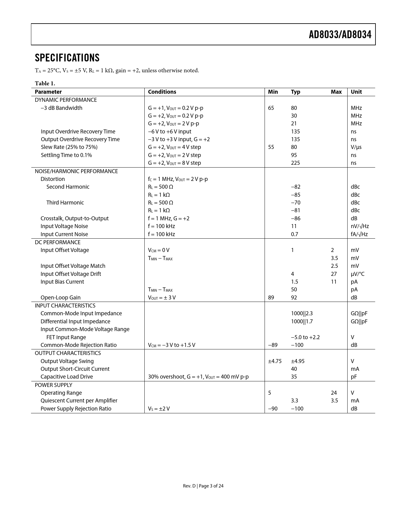 页数 / 页24 / 3 — AD8033/AD8034. SPECIFICATIONS. Table 1. Parameter. Conditions. Min. Typ. …