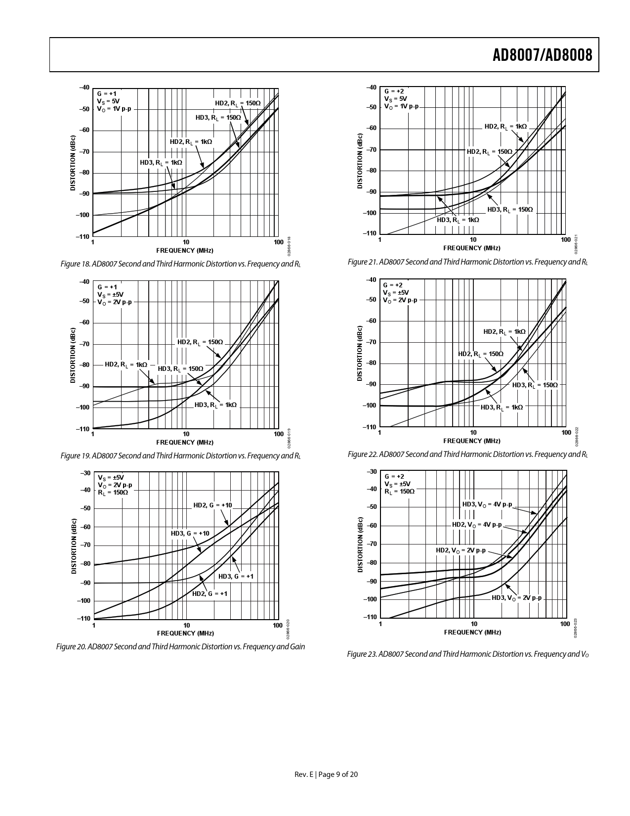 AD8007/AD8008–40–40G = +1G = +2VVS = 5VHD2, RS = 5VL = 150Ω–50V–50VO = 1V p-pO = 1V p-pHD3, RL = 150ΩHD2, R–60–60L = 1kΩc)c)BHD2, RBdL = 1kΩd((–70–70HD2, RL = 150ΩONION THD3, RL = 1kΩTIRR –80O –80TTOSSDIDI–90–90HD3, RL = 150Ω–100–100HD3, RL = 1kΩ–110–110 1 8 110100110100 01 -02 6- FREQUENCY (MHz)FREQUENCY (MHz) 866 86 02 02 Figure 18. AD8007 Second and Third Harmonic Distortion vs. Frequency and R Figure 21. AD8007 Second and Third Harmonic Distortion vs. Frequency and R L L –40–40G = +1G = +2VVS = ±5VS = ±5V–50V–50VO = 2V p-pO = 2V p-p–60–60c)c) BHD2, RL = 1kΩd(dB –70HD2, R(L = 150Ω–70ONHD2, RTIONTIL = 150ΩRR–80HD2, R–80L = 1kΩTOHD3, RL = 150ΩTOSSDIDI–90–90HD3, RL = 150Ω–100HD3, RL = 1kΩ–100HD3, RL = 1kΩ–110–110 22 110100 190 110100 0 6- 6- FREQUENCY (MHz)FREQUENCY (MHz) 86 286 0 02 Figure 19. AD8007 Second and Third Harmonic Distortion vs. Frequency and R Figure 22. AD8007 Second and Third Harmonic Distortion vs. Frequency and R L L –30–30VG = +2S = ±5VVVS = ±5V–40O = 2V p-p–40RRL = 150ΩL = 150ΩHD3, V–50HD2, G = +10–50O = 4V p-pc)c)BB –60HD2, VO = 4V p-pd –60d(HD3, G = +10(NNO –70–70TITIORRHD2, VO = 2V p-pTOTOS –80S –80DIDIHD3, G = +1–90–90HD2, G = +1–100–100HD3, VO = 2V p-p–110–110 0 110100110100 -02 -023 66 FREQUENCY (MHz) 66 FREQUENCY (MHz) 28 28 0 0 Figure 20. AD8007 Second and Third Harmonic Distortion vs. Frequency and Gain Figure 23. AD8007 Second and Third Harmonic Distortion vs. Frequency and VO Rev. E | Page 9 of 20 Document Outline FEATURES APPLICATIONS GENERAL DESCRIPTION CONNECTION DIAGRAMS TABLE OF CONTENTS REVISION HISTORY SPECIFICATIONS VS = ±5 V VS = 5 V ABSOLUTE MAXIMUM RATINGS MAXIMUM POWER DISSIPATION OUTPUT SHORT CIRCUIT ESD CAUTION TYPICAL PERFORMANCE CHARACTERISTICS THEORY OF OPERATION USING THE AD8007/AD8008 Supply Decoupling for Low Distortion LAYOUT CONSIDERATIONS LAYOUT AND GROUNDING CONSIDERATIONS GROUNDING INPUT CAPACITANCE OUTPUT CAPACITANCE INPUT-TO-OUTPUT COUPLING EXTERNAL COMPONENTS AND STABILITY OUTLINE DIMENSIONS ORDERING GUIDE