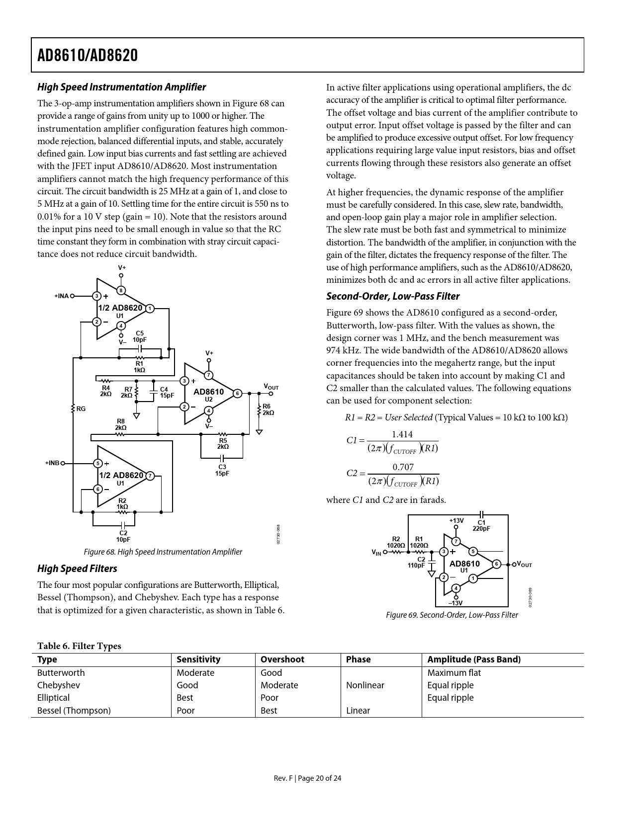 Butterworth Moderate Good Maximum flat Chebyshev Good Moderate Nonlinear Equal ripple Elliptical Best Poor Equal ripple Bessel (Thompson) Poor Best Linear Rev. F | Page 20 of 24 Document Outline FEATURES APPLICATIONS PIN CONFIGURATIONS GENERAL DESCRIPTION TABLE OF CONTENTS REVISION HISTORY SPECIFICATIONS ELECTRICAL SPECIFICATIONS ABSOLUTE MAXIMUM RATINGS ESD CAUTION TYPICAL PERFORMANCE CHARACTERISTICS THEORY OF OPERATION FUNCTIONAL DESCRIPTION Power Consumption Driving Large Capacitive Loads Slew Rate (Unity Gain Inverting vs. Noninverting) Input Overvoltage Protection No Phase Reversal THD Readings vs. Common-Mode Voltage Noise vs. Common-Mode Voltage Settling Time Output Current Capability Operating with Supplies Greater than ±13 V Input Offset Voltage Adjustment Programmable Gain Amplifier (PGA) High Speed Instrumentation Amplifier High Speed Filters Second-Order, Low-Pass Filter High Speed, Low Noise Differential Driver OUTLINE DIMENSIONS ORDERING GUIDE