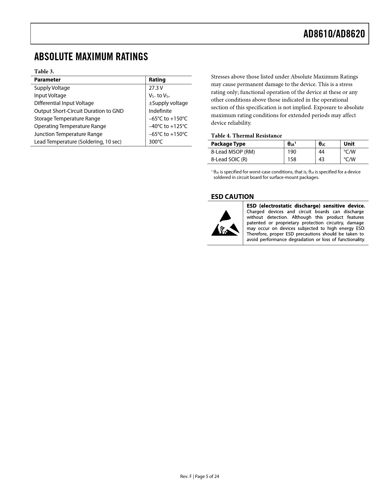 AD8610/AD8620 ABSOLUTE MAXIMUM RATINGS Table 3 Parameter Rating Table 4 Thermal Resistance Package Type θ 1 θJC Unit